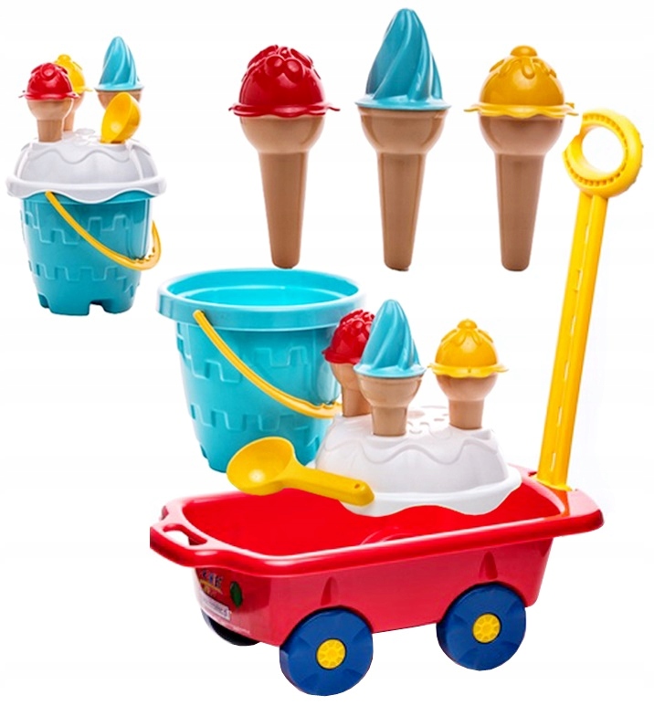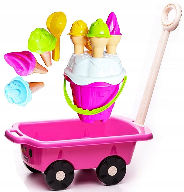 ТЕЛЕЖКА С РУЧКОЙ + НАБОР ПЕСКА (ВЕДРО, ЗАМОК, СОВКИ ДЛЯ МОРОЖЕНОГО, ЛОПАТА)