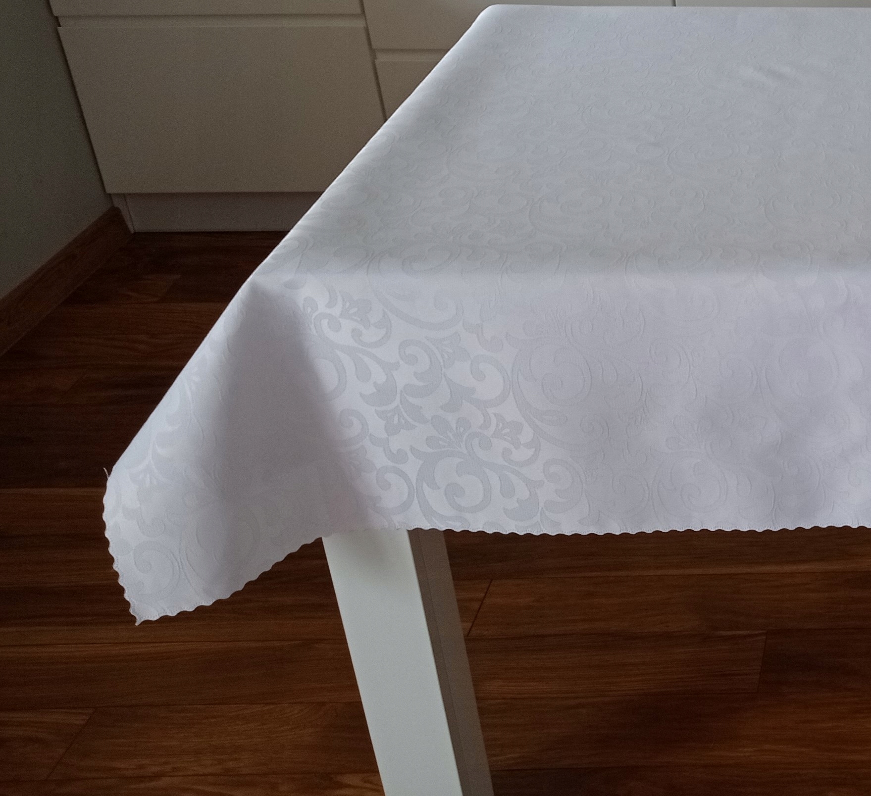Плотная скатерть жаккардового переплетения, однотонная, с матовым узором на блестящем фоне, полученная путем соответствующего подбора переплетения, атласного и саржевого. плетения.