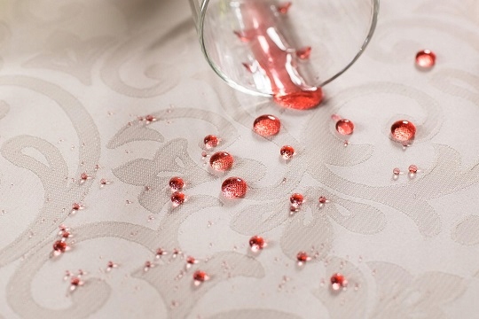 Скатерть водонепроницаемая и грязеотталкивающая, пролитая жидкость не впитывается в ткань, достаточно вытереть ее губкой или кухонным полотенцем.
