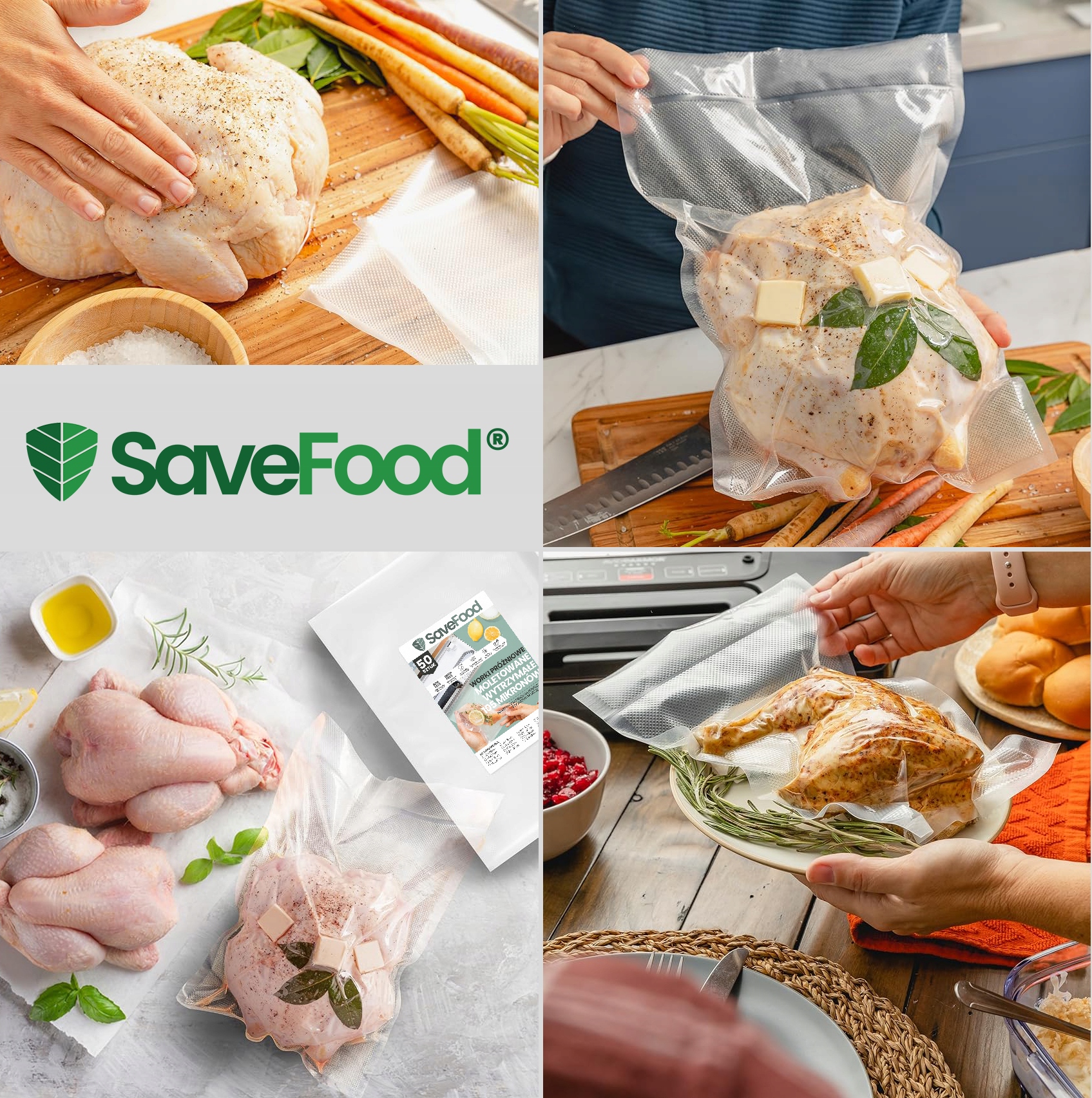 вакуумные рукава для вакуумной упаковки SaveFood изготовлены из коммерческой многослойной пищевой фольги PA/PE, который блокирует доступ влаги и кислорода, предотвращая обезвоживание и ожоги в морозильной камере. Рукава идеально подходят для упаковки отдельных порций еды, мяса, сыра, рыбы, колбас и других.