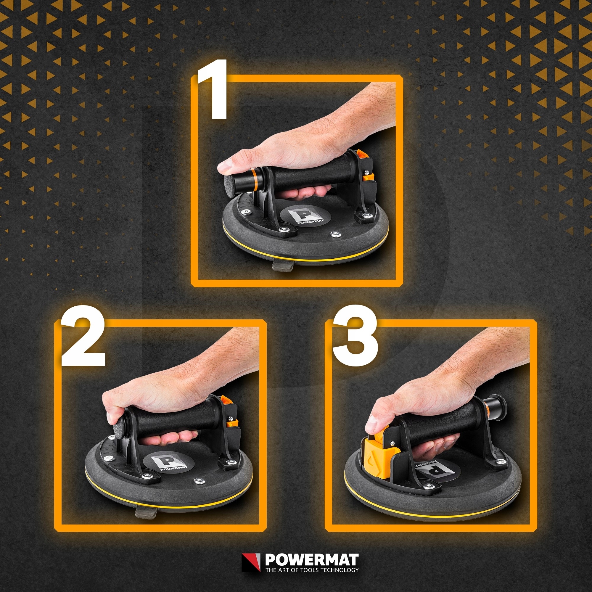 Вакуумная присоска обеспечиваетвпечатляющую силу всасывания до 190 кг, что гарантирует надежный захват и устойчивостьпри перемещении даже очень тяжелых и крупных элементов.