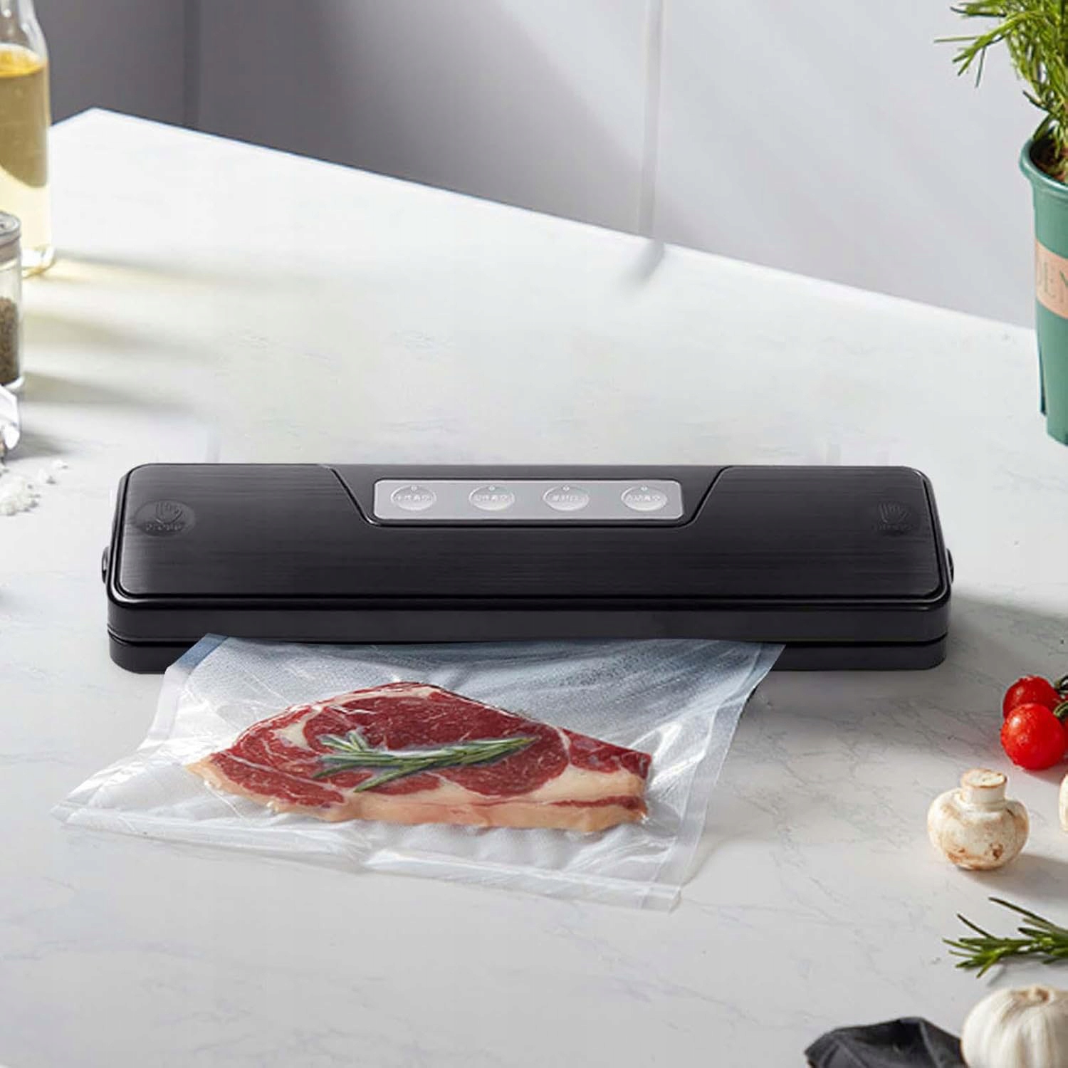 Наша вакуумная герметизация использует систему, активированную нагреванием, для удаления воздуха и создания герметического уплотнения. Это помогает сохранить свежесть, вкус, аромат и питательные ценности пищи - идеально подходит для запечатывания мяса, овощей, фруктов и многого другого.
