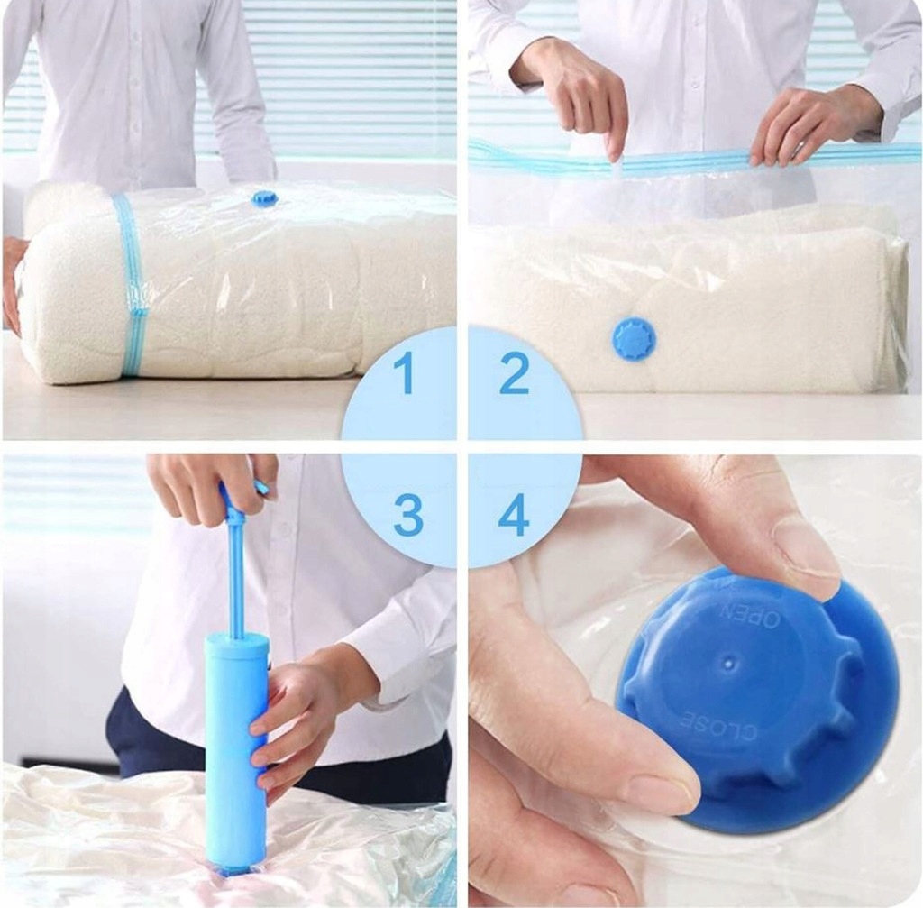 Они чрезвычайнопросты в использовании. Просто положите в них одежду или пуховое одеяло, закройте застежку зажимом, а затем удалите воздух с помощью пылесоса.