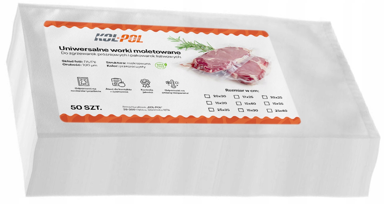 Многослойная поверхность толщиной 100 мкм изготовлена из прочного материала PE/PA. Это гарантирует высокую устойчивость пакетов к разрывам и проколам. Они также устойчивы к изменениям температуры, поэтому их можно хранить в морозильной камере и нагревать в микроволновой печи. Используемый материал не содержит вредных веществ, в том числе: BPA, фталаты и свинец.