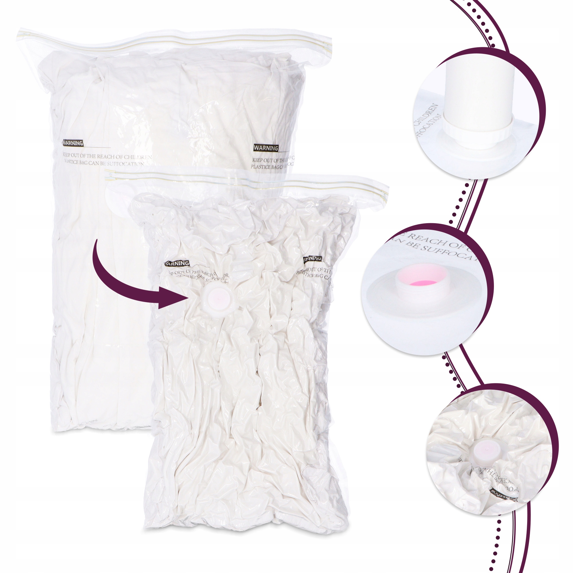 Планируете поездку? Вакуумные пакеты — идеальное решение, которое позволит вам эффективно упаковать вещи в чемодан меньшего размера. Просто купите насос или выберите комплект сумок с насосом, и вы быстро и легко спрессуете одежду! Вы также можете использовать пылесос, чтобы сжать свои вещи.