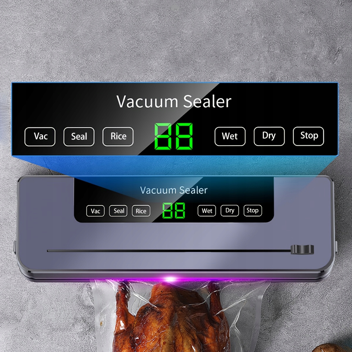 Дизайн с двойным уплотнением и зеленый цифровой дисплей: в этом вакуумном упаковщике для пищевых продуктов используется инновационная конструкция с двойным нагревательным элементом, создающая два параллельных уплотнения для двойной защиты, гарантируя каждый раз безопасное и надежное уплотнение. Синий цифровой дисплей не только подчеркивает его современный внешний вид, но и четко показывает статус режима и обратный отсчет, позволяя отслеживать процесс вакуумирования в режиме реального времени.