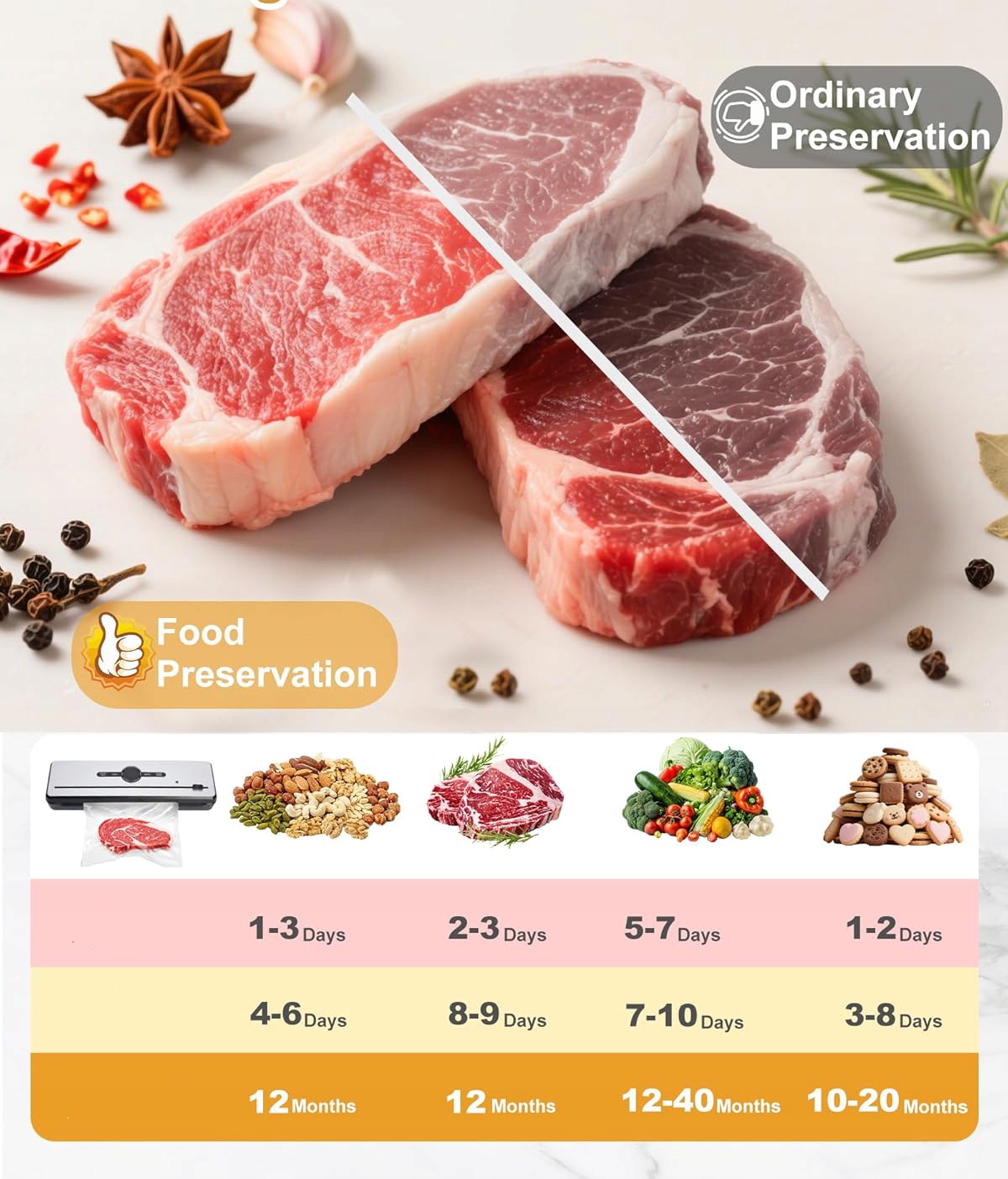 Технология Vac-Sealing Preservation позволяет сохранять продукты свежими до 10 раз дольше, чем в случае обычного хранения. Морепродукты и мясо остаются свежими 12–28 дней вместо 2–3 дней, фрукты и овощи — 12–40 дней вместо 5–7 дней, а сухофрукты/орехи — 12–50 дней вместо 4–6 дней. Наслаждайтесь более здоровой и вкусной едой с длительным сроком хранения.