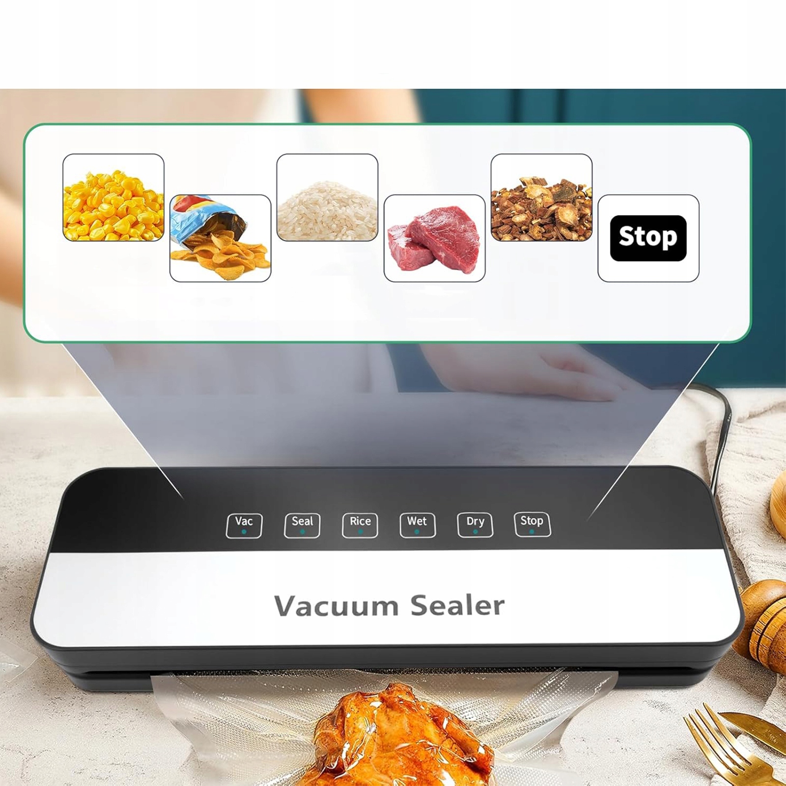 🧊🥫 Кнопка вакуума – ручная регулировка уровня вакуума (используется в сочетании с кнопкой запайки); кнопка сварки – используется для сварки; рисовая пуговица – подходит для вакуумной запайки тяжелой упаковки; кнопка «мокрый» — подходит для вакуумной упаковки влажных продуктов; кнопка «Сушка» – подходит для вакуумной упаковки сухих продуктов; кнопка стоп – останавливает работу.