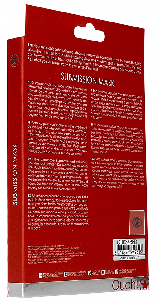 Ткань позволяет небольшое количество света, ослабляющее зрение и возбуждающее другие чувства. Блестящий черный капюшон может носить и Она, и Он. Тонкая и легкая ткань позволяет дышать и слышать звуки шлепания. Самое приятное то, что у вас по-прежнему есть доступ ко рту объекта!