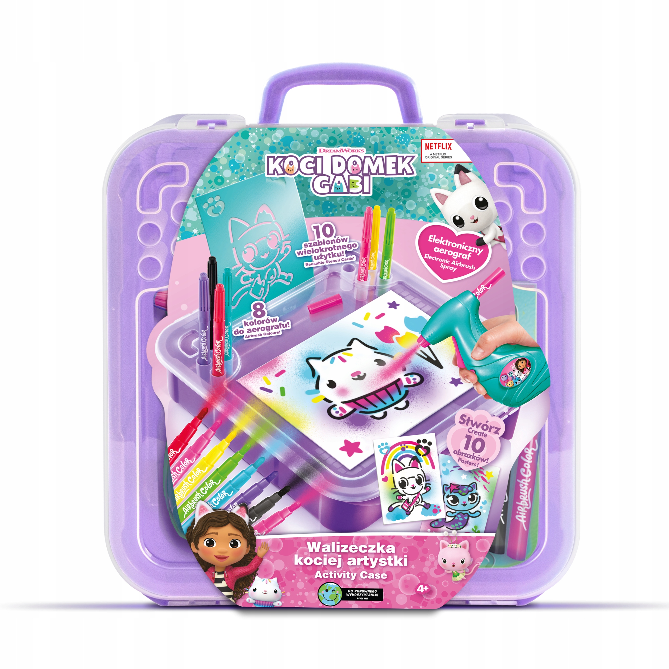 Если вы любите сериал «Кошачий домик Габи», этот набор идеально подойдет вам! В удобном чемодане вы найдете электронный аэрограф, многоразовые шаблоны, маркеры, наклейки и листы бумаги – все необходимое для создания красочных, фантастических картин с любимыми героями сериала.