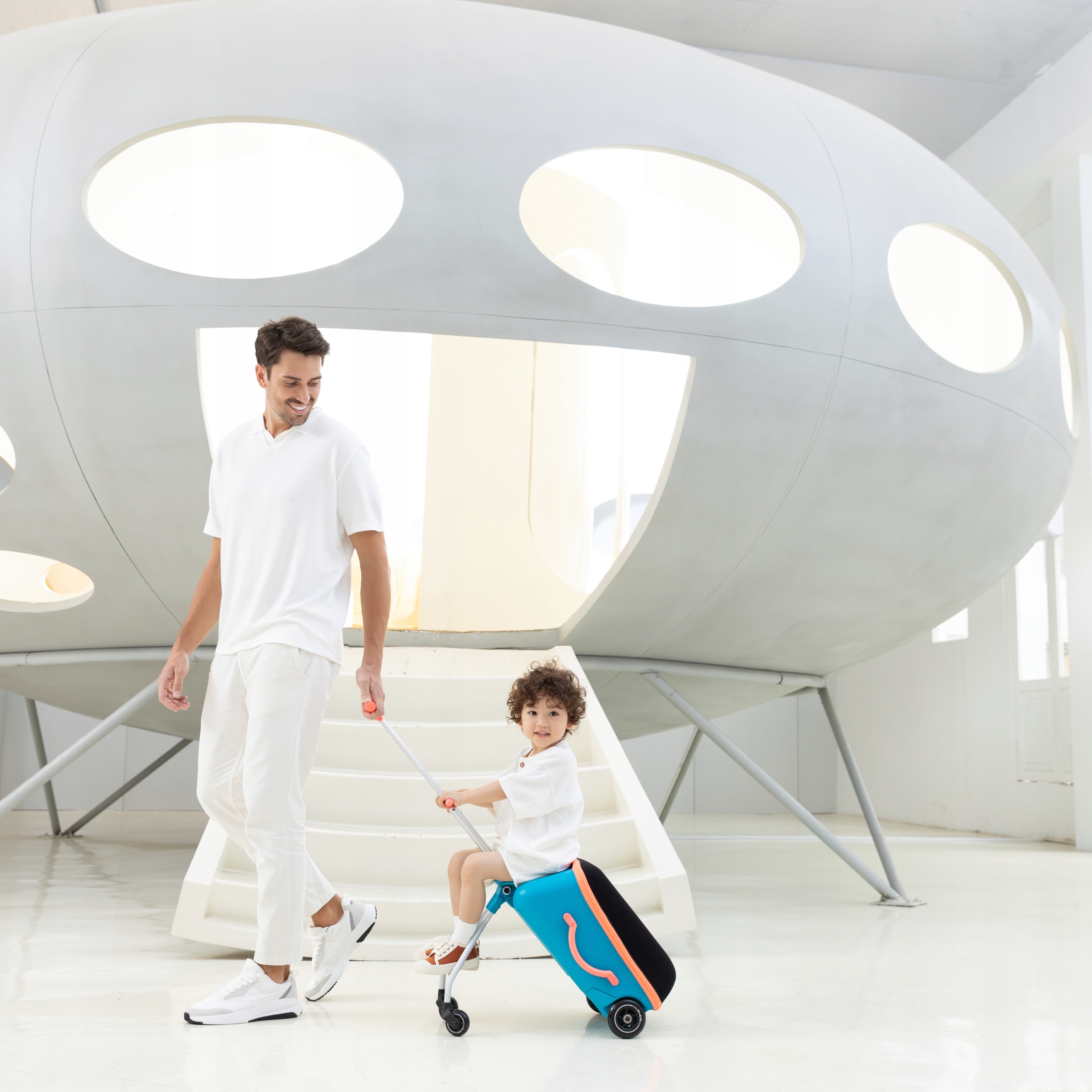Просто нажмите одну кнопку, чтобы выдвинуть колеса и опустить сиденье. Регулируемая ручка до 109 см приводит к осуществлению чемодана как родителями, так и старшими братьями и сестрами