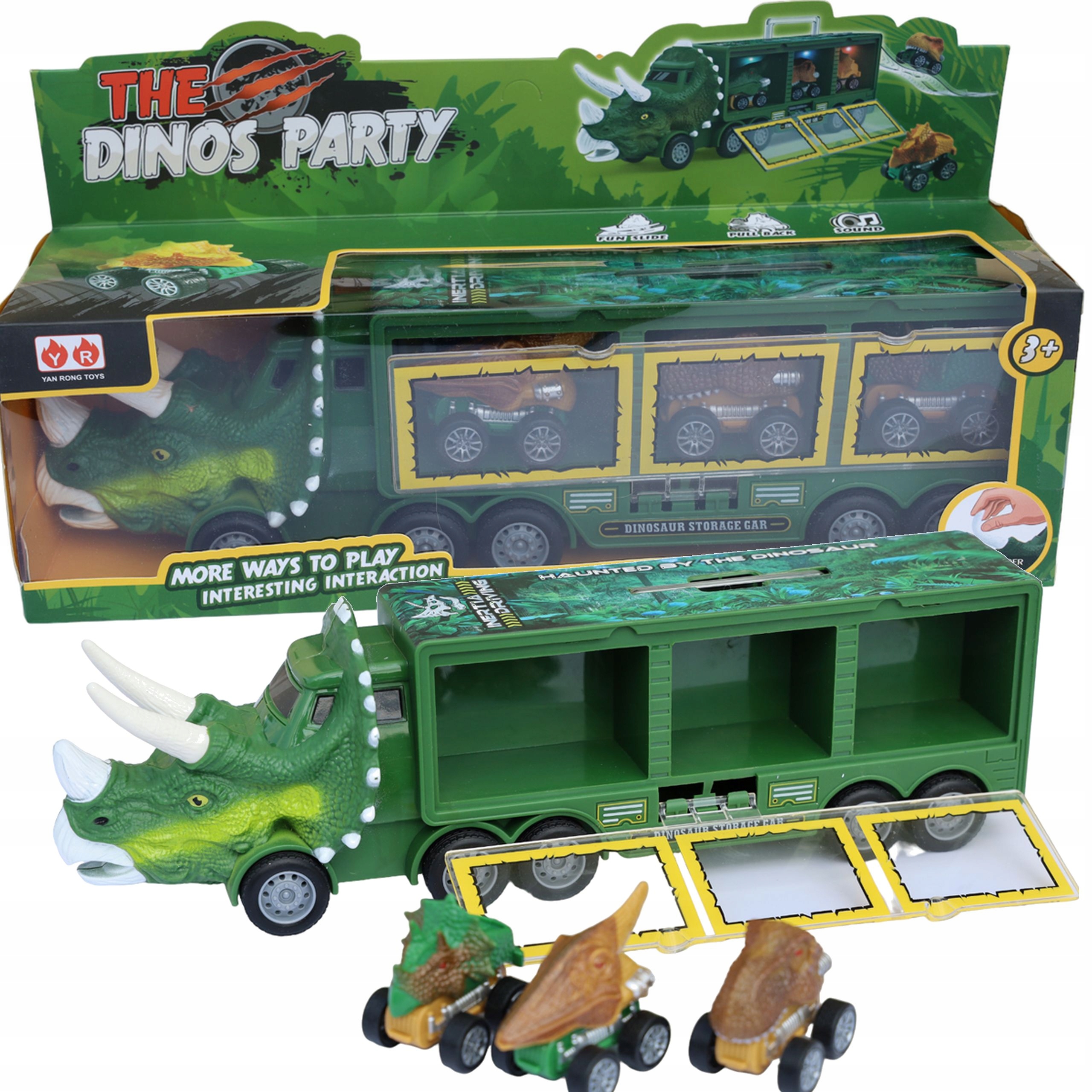 Вместо классического полуприцепа он оснащен чемоданом с выдвижной ручкой, облегчающей его переноску. Внутри есть место для 3 машин. Просто откройте бесцветную крышку и можно вынимать машины. В комплект входит специальная горка, которая крепится к прицепу и по ней машинки могут скатиться. В набор входят 3 электромобиля в форме популярных динозавров.