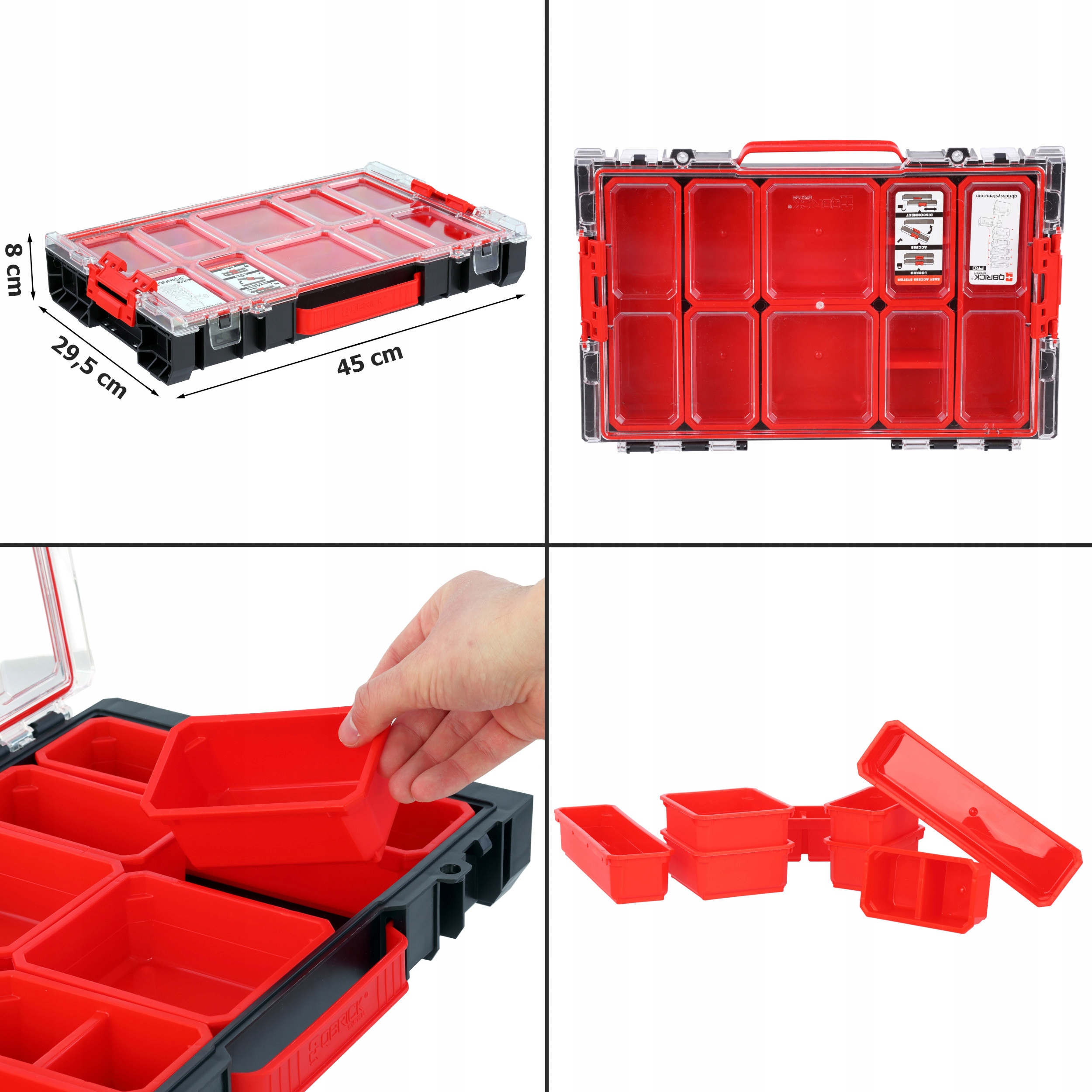 Модульный дизайн серии Pro обеспечивает легкий транспорт и хранение. Просоистемные коробки могут быть объединены в любой конфигурации. Модульные коробки являются идеальным решением для работы в мастерской, гараже или складе. Обеспечить 100% безопасность электроинструментов, которые вы несете с собой. Усиленная структура тела обеспечивает высокую устойчивость к удару и механическим повреждениям. Уплотнение в крышке обеспечивает отличную защиту от пыли, грязи и влаги. CM, 2, 2 средние коробки 24,5x7x5 см, 2 большие коробки 12,5x11x5 см. Различные модели коробок облегчают поддержание порядка в организаторе и легко находят необходимые вещи