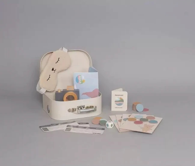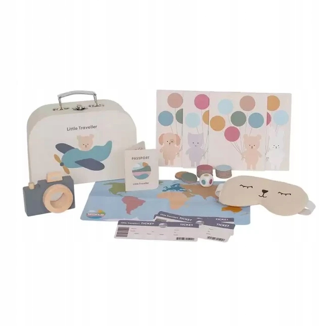 В чемодане есть все необходимое, чтобы спланировать отпуск и сделать время, проведенное в путешествии, более приятным. В набор маленького путешественника и исследователя входят: чемодан, паспорт, билеты, фотоаппарат с калейдоскопом для запечатления потрясающих видов, маска на глаза, когда придет время отдыха, которая облегчит засыпание во время путешествия, карта благодаря с помощью которого вы сможете отслеживать свое путешествие, а игра в лотерею - шарики, когда наступит скука.