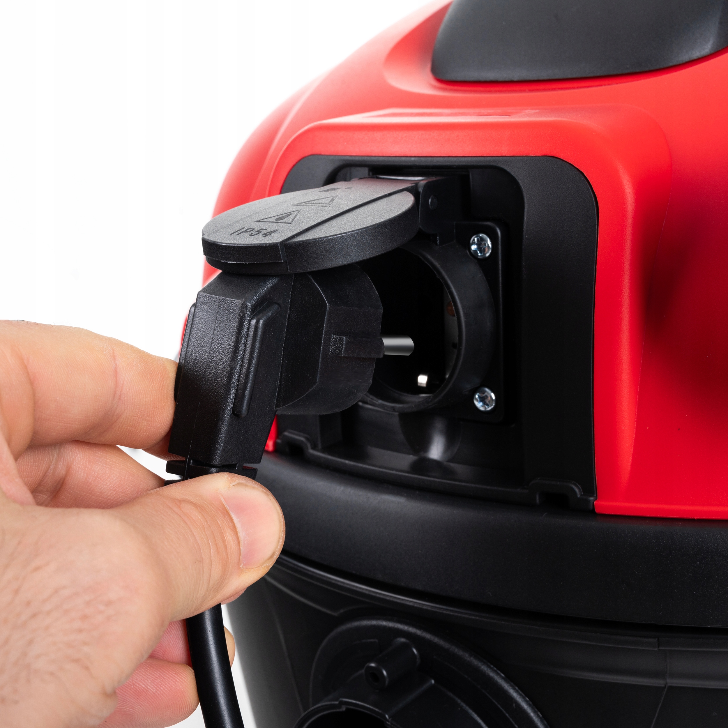 В пылесосе имеется розетка для электроинструментов до 2000Вт. Благодаря этому можно удобно работать, например, при шлифовке штукатурки, подключив так называемый жирафа. В отличие от конкурирующей продукции, розетка позволяет подключить устройство мощностью до 2000Вт. Вы получите удобный переходник для крепления шланга инструмента к набору.