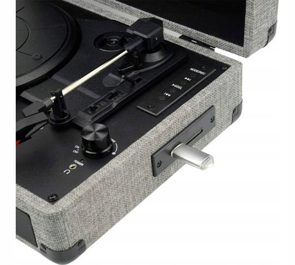 - Портативная конструкция со встроенными динамиками позволяет без проблем транспортировать и хранить проигрыватель.