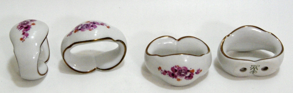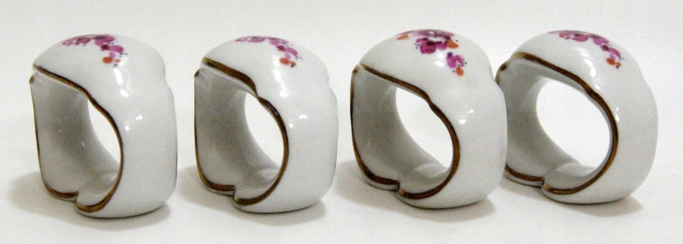 Предмет аукциона — красивый старинный набор из 4 колец для салфеток, выполненных из белого фарфора, украшенных цветочным узором.