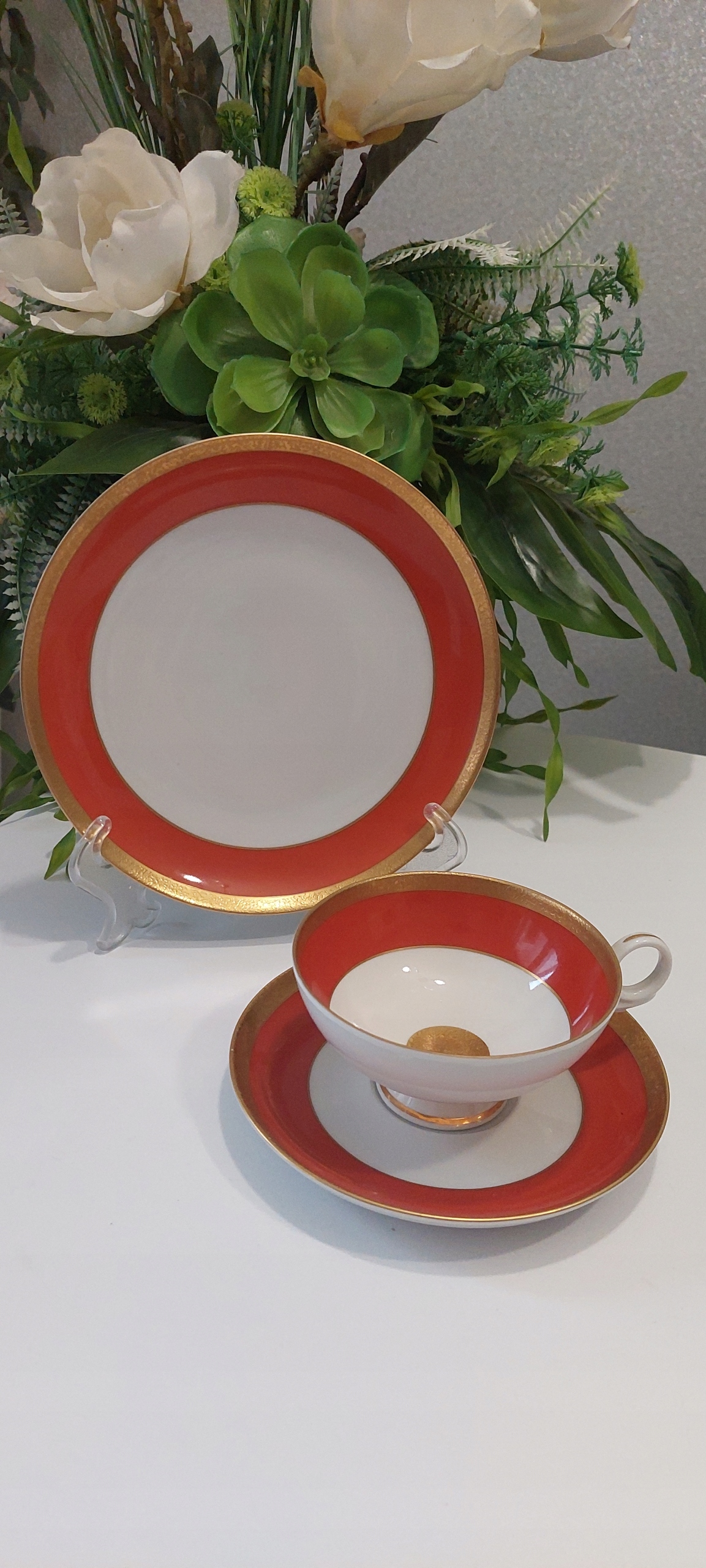 Трио WALLENDORF с размерами: высота чашки 5 см, диаметр чаши 11 см, диаметр тарелки 15 см, диаметр десертной тарелки 19 см.