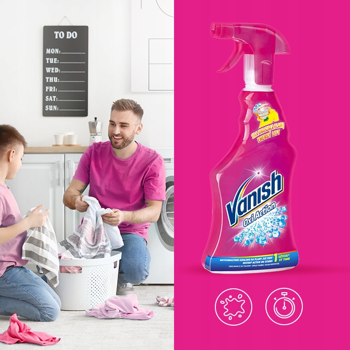 Больше не беспокойтесь о своей любимой одежде. Жидкость Vanish Oxi Action Pink не обесцвечивает их, безопасна для использования на цветных и белых тканях**.