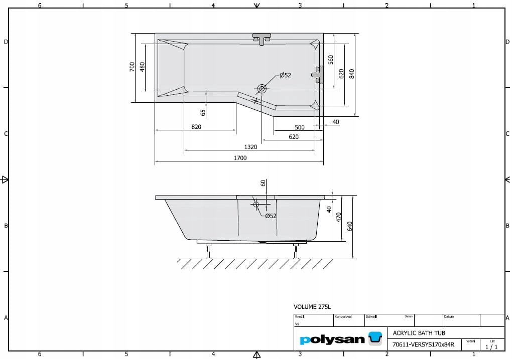 Асимметричная ванна 170х85х70х47 см, белая, акрил, MADE IN EU, VERSYS правая