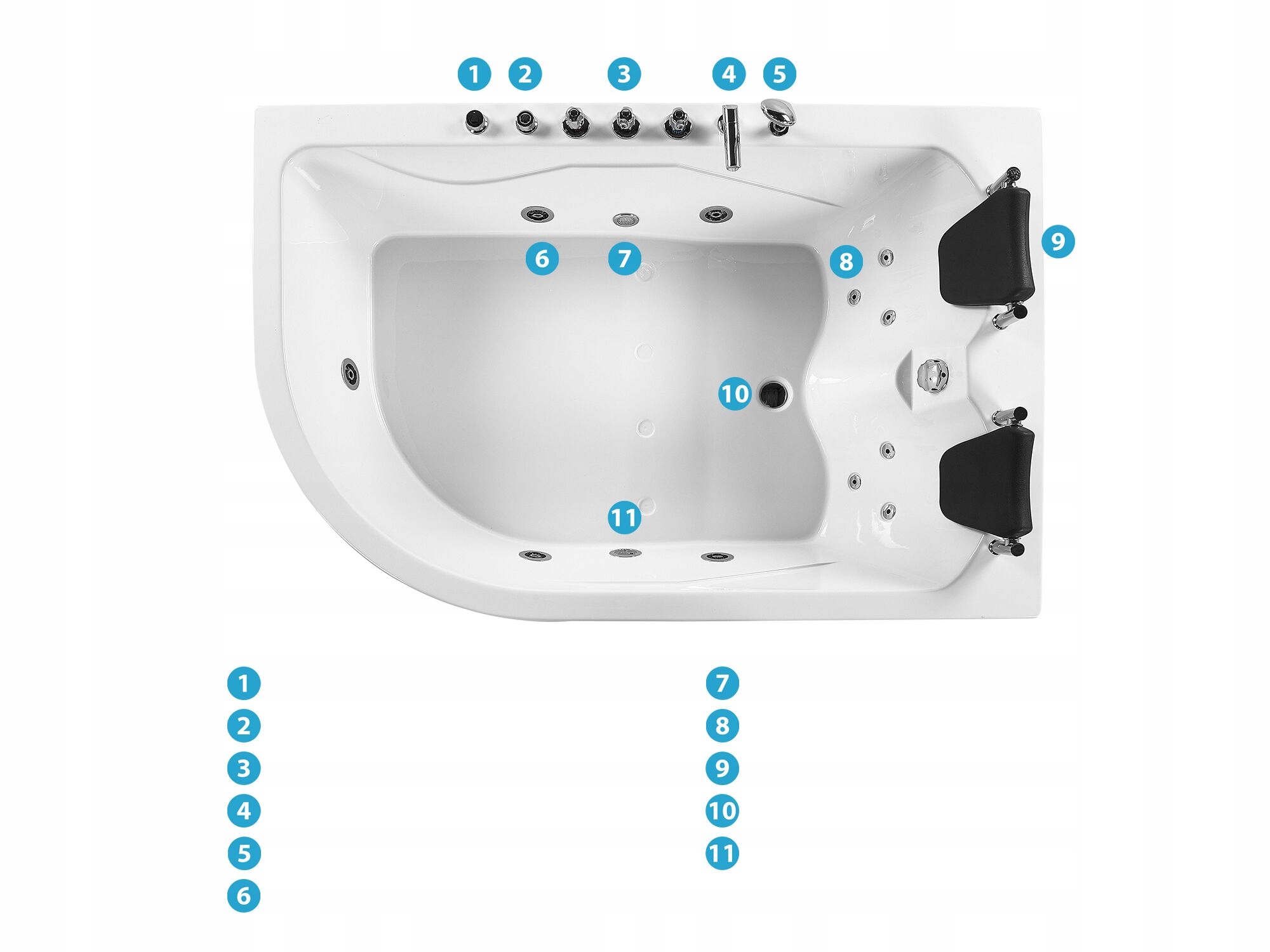 В предложение входит: 1 гидромассажная ванна, 1 шланги для горячей и холодной воды, 1 смеситель, 1 ручной душ, 2 подголовника, 1 система перелива, 1 х Дренажная труба