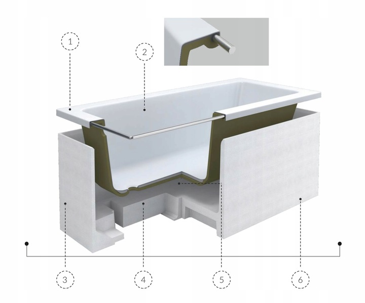 Входящий в комплект стабилизирующий держатель из EPS обеспечивает высокую устойчивость ванн к давлению и 100% устойчивость всей ванны.