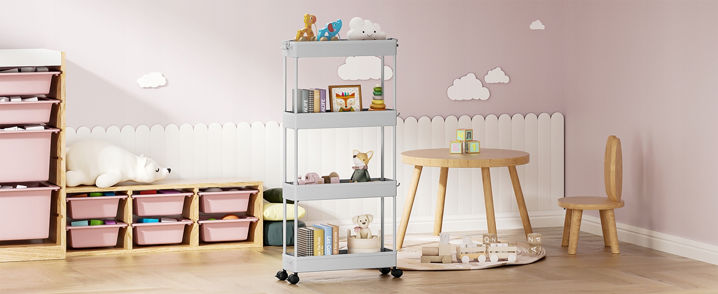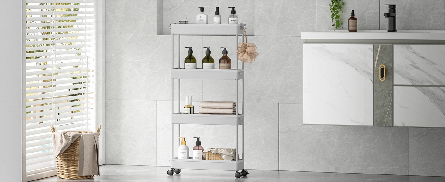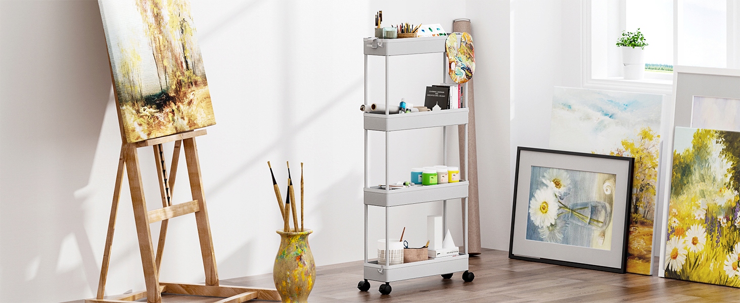 - Тонкий 4-градусный тележка для хранения идеально предназначена для узкого использования дома. Эта кухонная коляска идеально подходит для кухни, ванной комнаты, гаража, прачечной, офиса, квартиры, библиотеки или между стиральной машиной и сушилкой. Легко разместить и двигаться. Размеры: 13 x 40 x 86,3 см.
