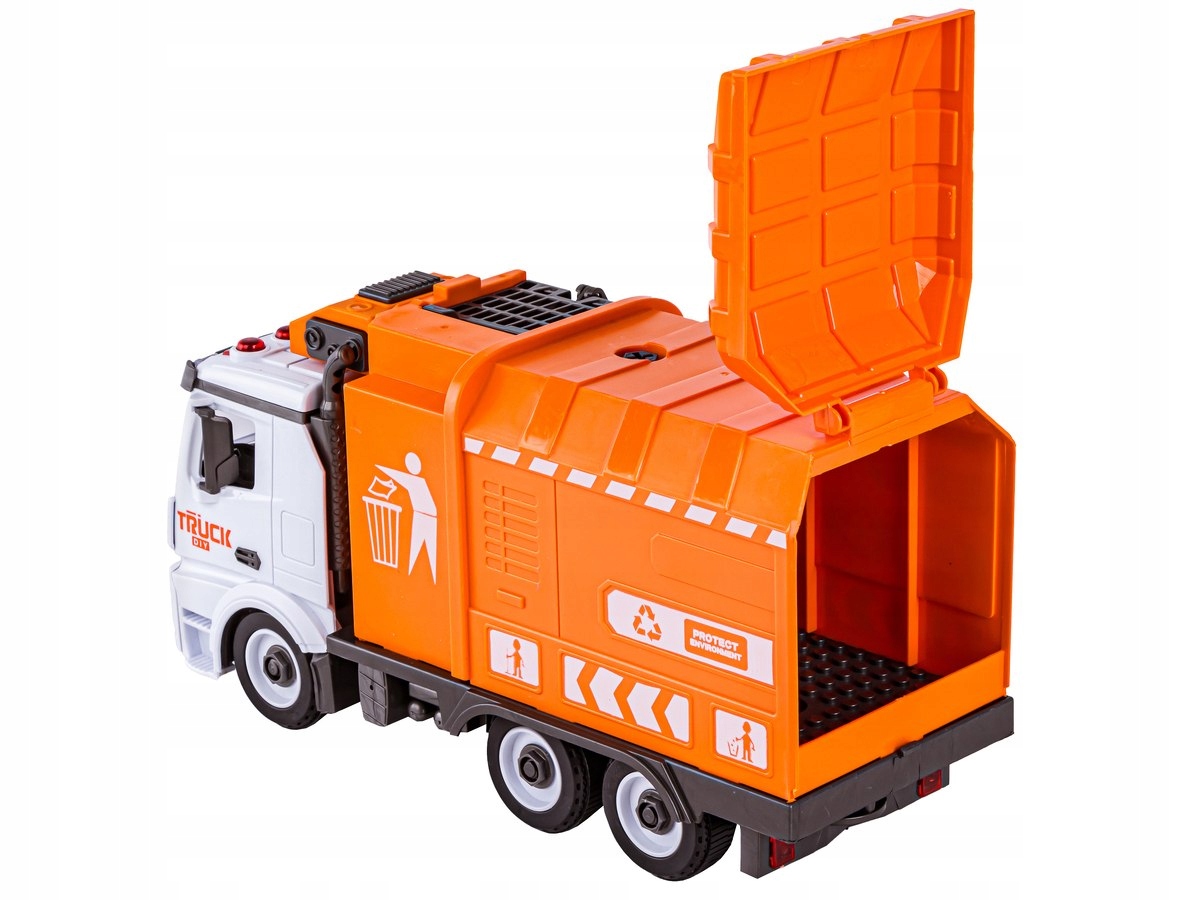 Сам мусоровоз работает как настоящая техника. Имеет боковой подъем мусорного бака – с помощью специальной ручки мы можем выбросить содержимое мусорного бака в контейнер. Когда содержимое заполнено, мы можем опустошить все, используя открывающуюся заднюю дверь :)