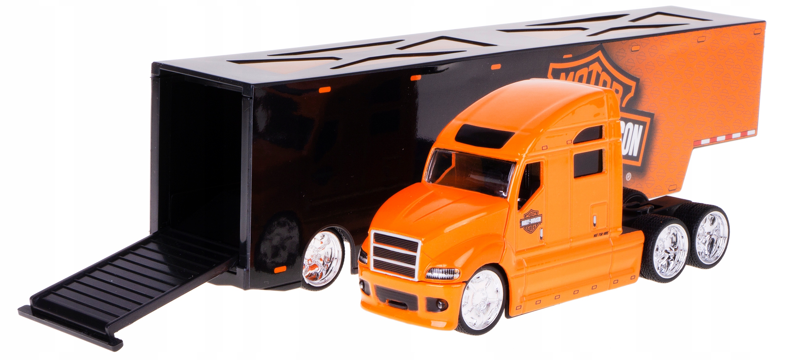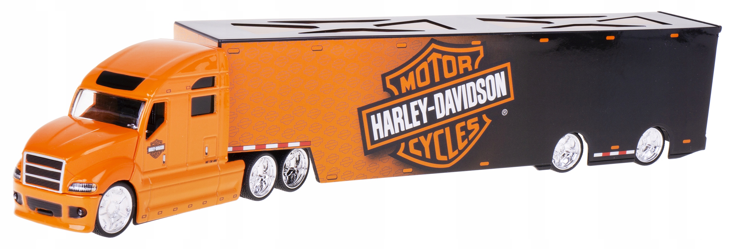 Модель грузовика «Тира» с полуприцепом и открывающимся задним люком выполнена из металла и пластика с резиновыми шинами по лицензии Harley-Davidson. от MAISTO в масштабе 1:64.