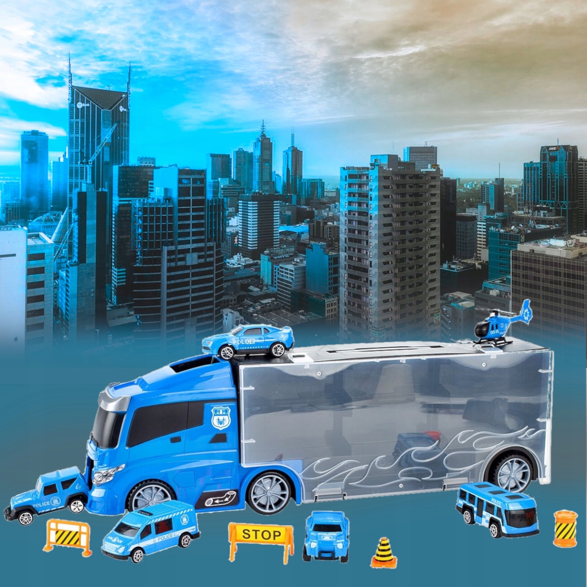 Каждый эвакуатор имеет две боковые открывающиеся стороны. С одной стороны он наполнен транспортными средствами и аксессуарами, с другой – место для до 6 транспортных средств из домашней коллекции вашего ребенка.