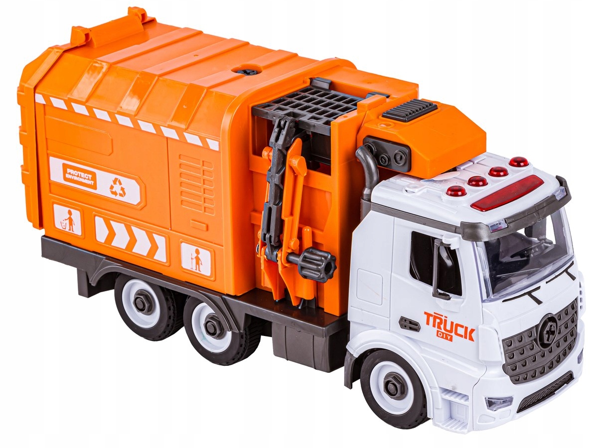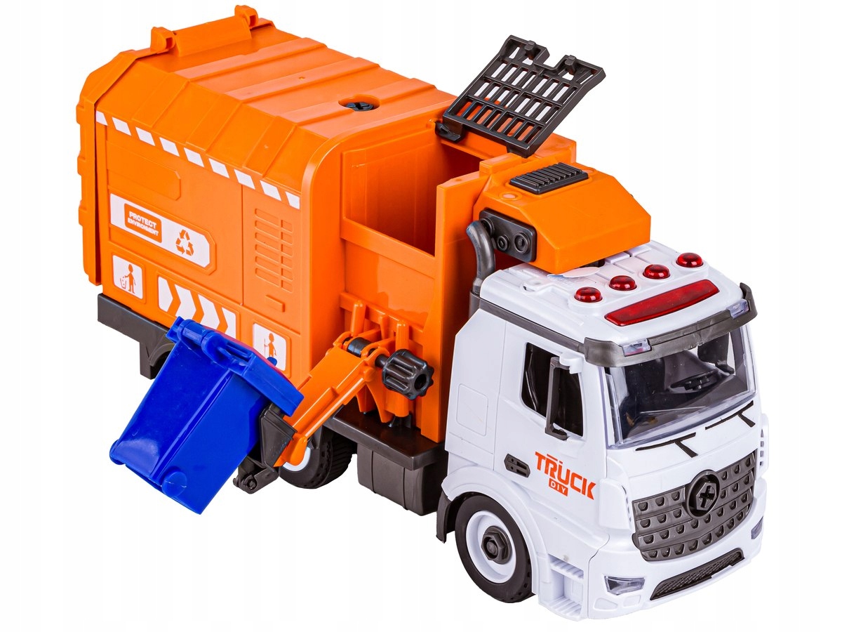 Сам мусоровоз работает как настоящая техника. Имеет боковой подъем мусорного бака – с помощью специальной ручки мы можем выбросить содержимое мусорного бака в контейнер. Когда содержимое заполнено, мы можем опустошить все, используя открывающуюся заднюю дверь :)