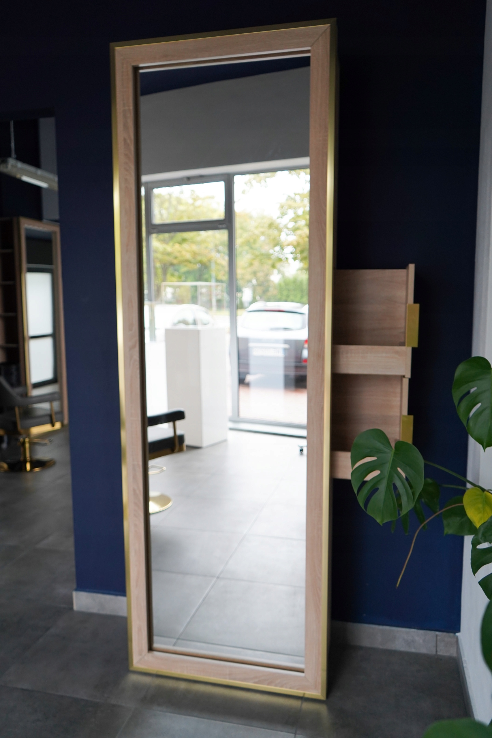 Красивая массивная консоль с огромным зеркалом, золотой границей, вместительными ящиками и полками.