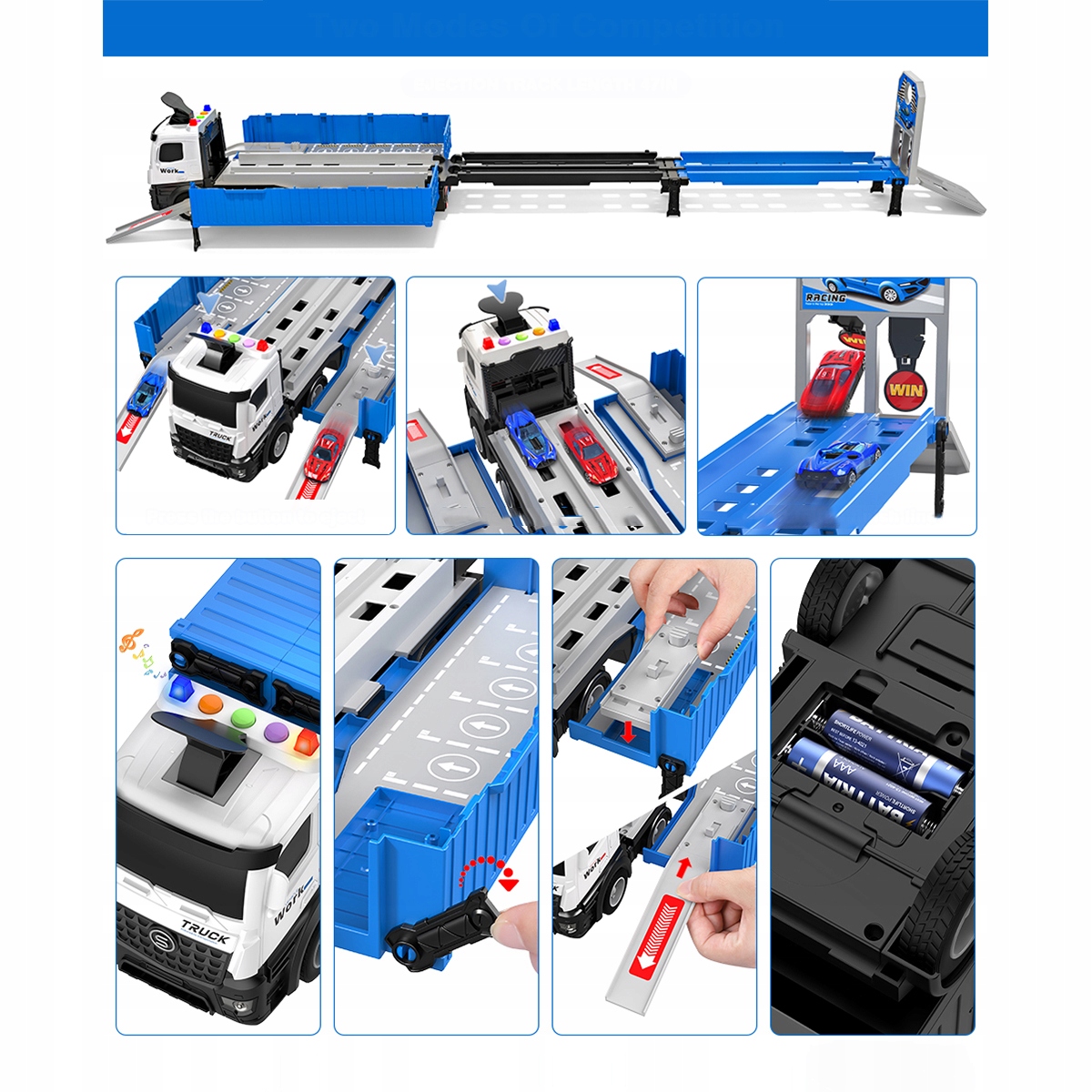 Наш грузовик — сборная игрушка. Он оснащен транспортным отсеком и может загружать и перевозить 8 небольших гоночных автомобилей. Он также имеет простую в использовании механическую конструкцию, которая позволяет детям испытать процесс транспортировки, стимулирует творческие способности и помогает развивать пространственное восприятие, координацию и социальные навыки посредством моделирования транспорта и гонок.