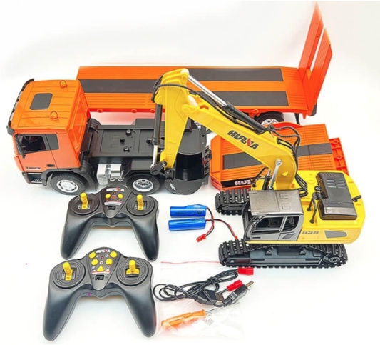 Дистанционно управляемый грузовик с полуприцепом - платформа с экскаватором.