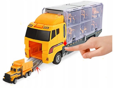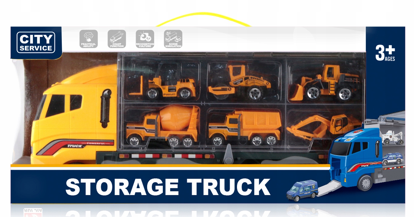 Набор состоит из большого грузовика для перевозки легковых автомобилей и 6 строительных машин.
