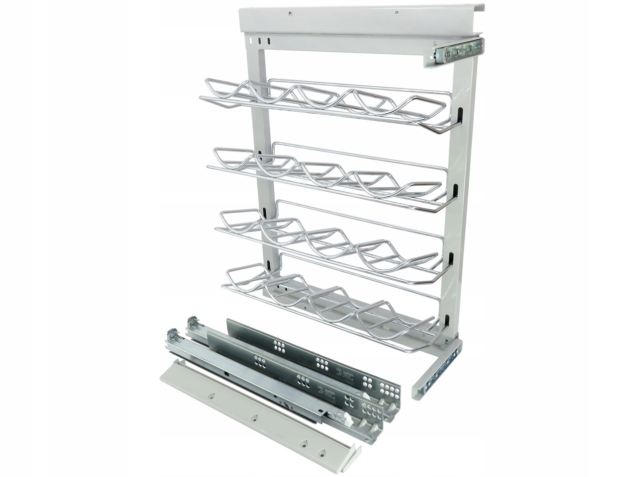 груз для бутылок - еще одно предложение в Strarax. Предназначен для удобного хранения бутылок на проволочных полках. Корзины / полки могут быть легко установлены. Четыре бутылки могут быть размещены на каждой полке. Все работы на руководствах известной компании Blum с функцией полного слайда и мягким закрытием. Допустимая система системы составляет 30 килограммов.