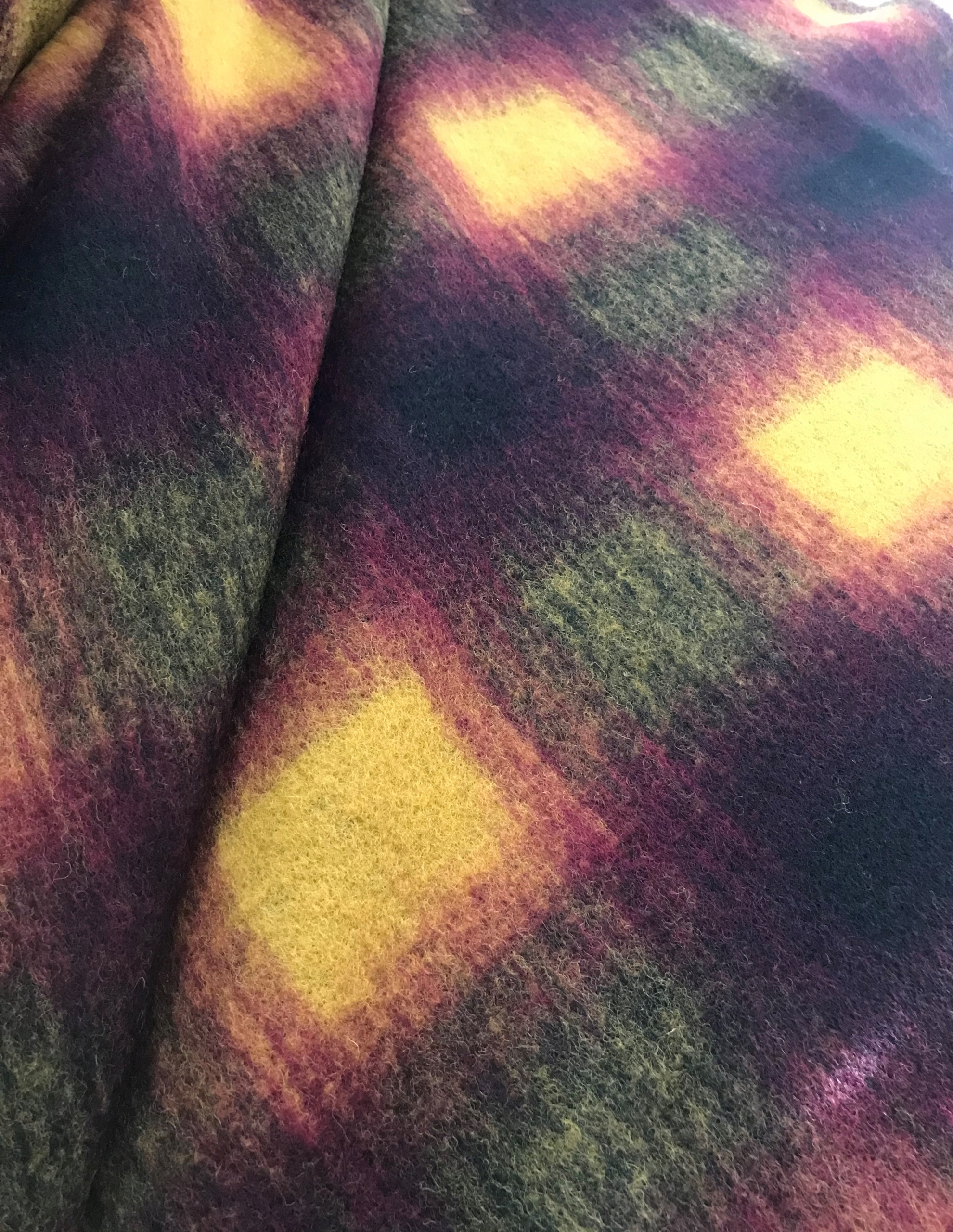 Пропаренная шерсть – плотная, теплая и в то же время очень мягкая и легкая шерстяная ткань. Шерсть обладает хорошими теплоизоляционными свойствами, благодаря всем этим характеристикам запаренная шерсть идеально подходит для осенне-зимнего периода. МОДНЫЙ КЛЕТОЧНЫЙ УЗОР В ФИОЛЕТОВЫХ И ЖЕЛТЫХ ОТТЕНКАХ!