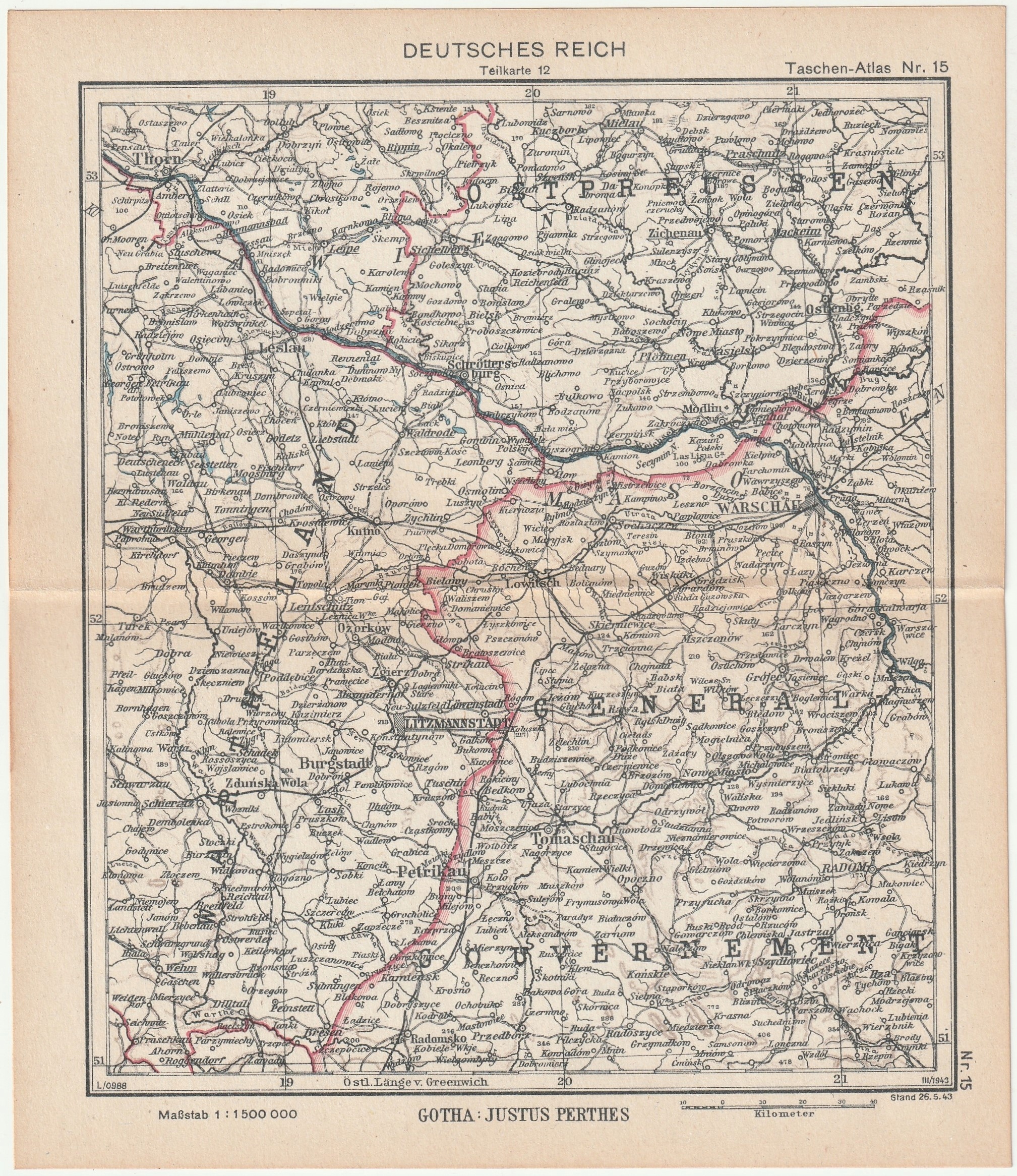 Варшава, Лодзи. Borderland of General правительства и страна Варты, до 1944 года, издание Юстуса Перта, Гота; Лист сложен пополам; Размеры листа после распространения: ок