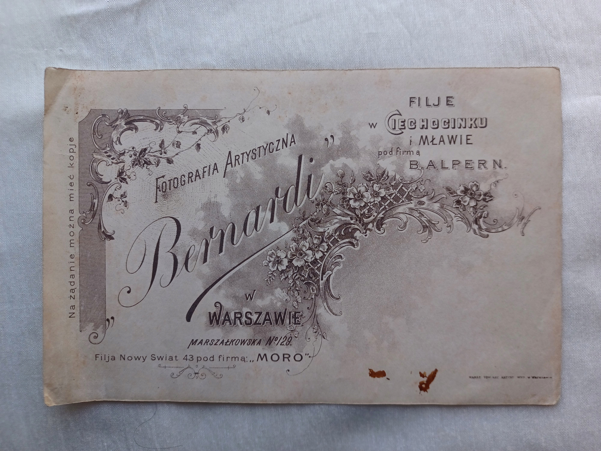 Старая оригинальная довоенная бумажная реклама фотостудии Бернарди в Варшаве, Цехоцинеке и Млаве. Оригинальный. Рекламные объявления такого типа наклеивались на оборотную сторону картонных фотографий. Датировка: начало 20 века. Размеры: 110 х 167 мм. Состояние: - на мой взгляд хорошее, небольшие загрязнения, потертости, пожелтение бумаги, все видно на сканах. Смело совершайте покупки.