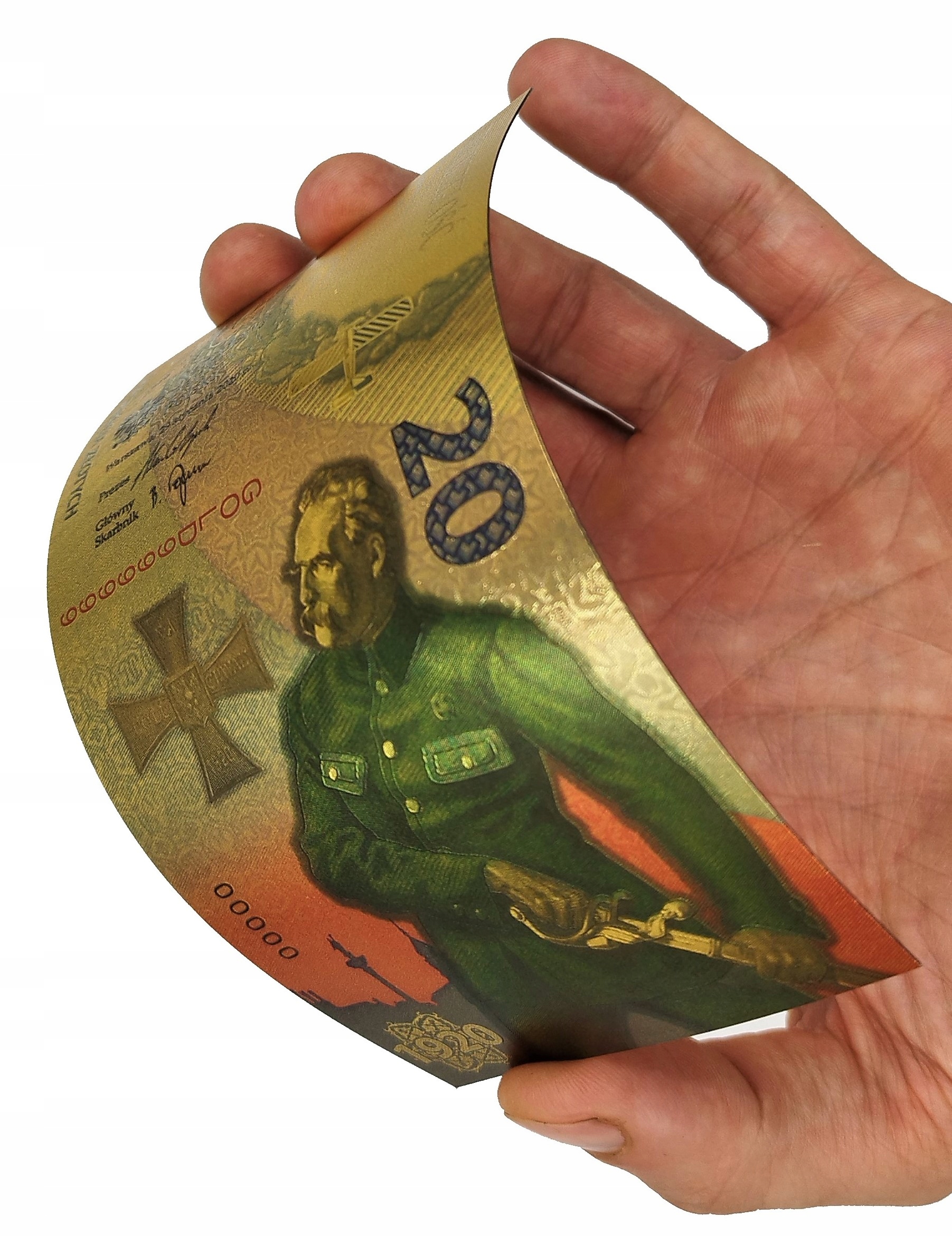 Реплика польской коллекционной банкноты 2020 года того же номинала из ПВХ и покрыта золотой фольгой.