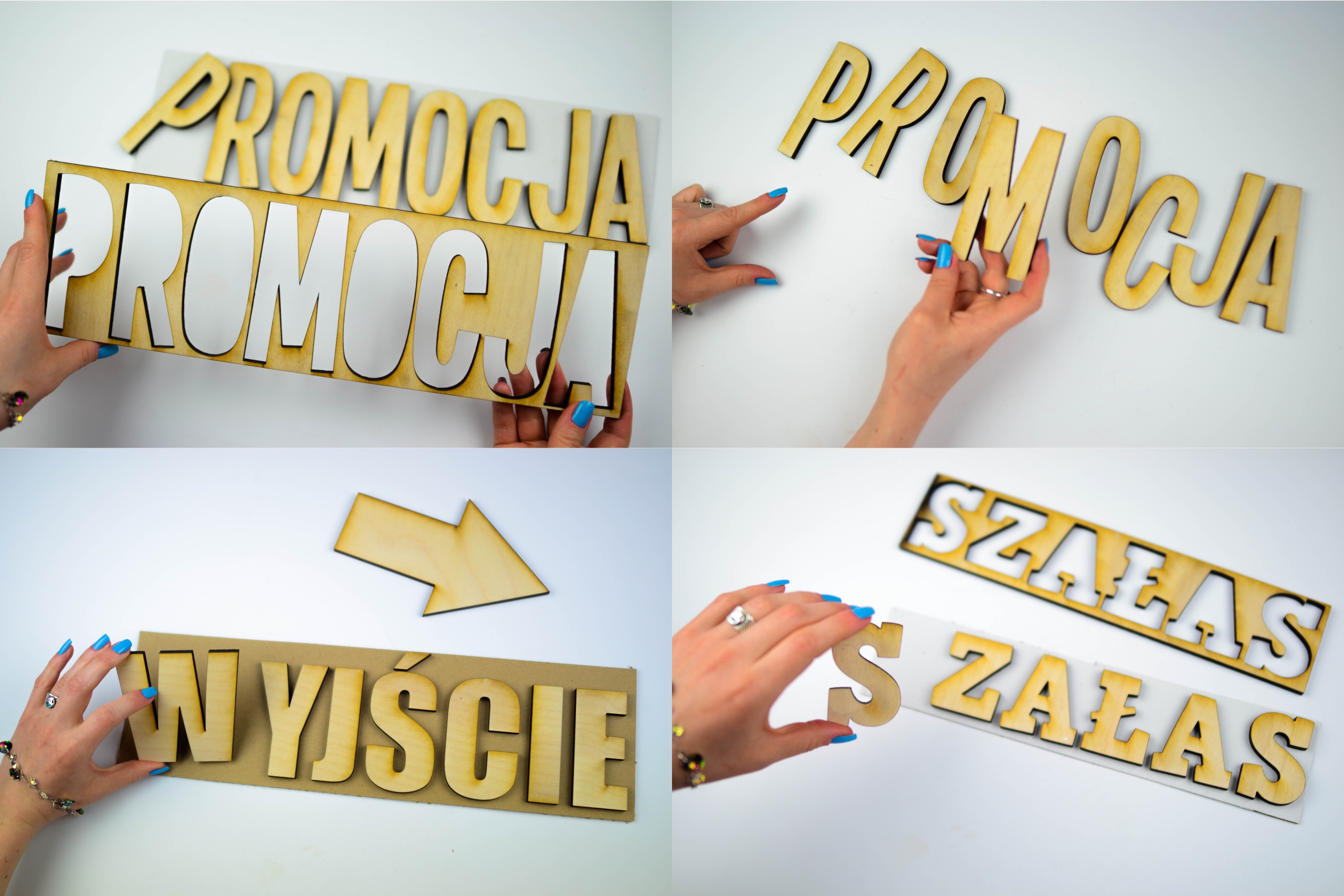 Буквы точно вырезаны лазером из ламинированного картона HDF толщиной 3 мм или березовой фанеры толщиной 3 мм. Установка букв – самостоятельно (с использованием двухстороннего пенопласта или клея). Буквы подходят только для интерьера. Буквы из фанеры можно использовать на открытом воздухе, но они должны быть пропитаны (как и дерево). На этом аукционе мы продаем отдельные буквы - каждая буква вырезается как отдельный элемент.