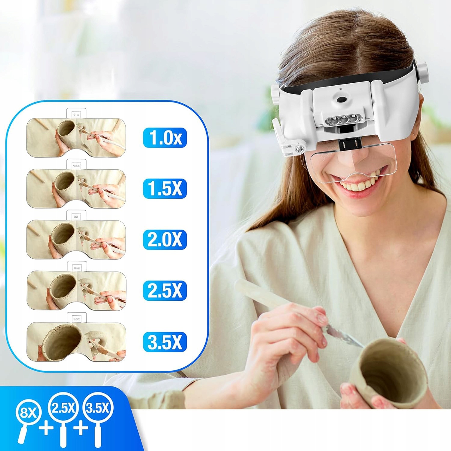 Этот увеличительный свет головы, подаваемый без использования рук, имеет два гнезда объектива и фиксированную переднюю линзу с увеличением 8x, что позволяет одновременно использовать один или оба объектива. Наш продукт содержит пять сменных линз (1x, 1,5x, 2x, 2,5x и 3,5x) и дополнительную 8 -кратную линзу, что обеспечивает широкий диапазон увеличений.