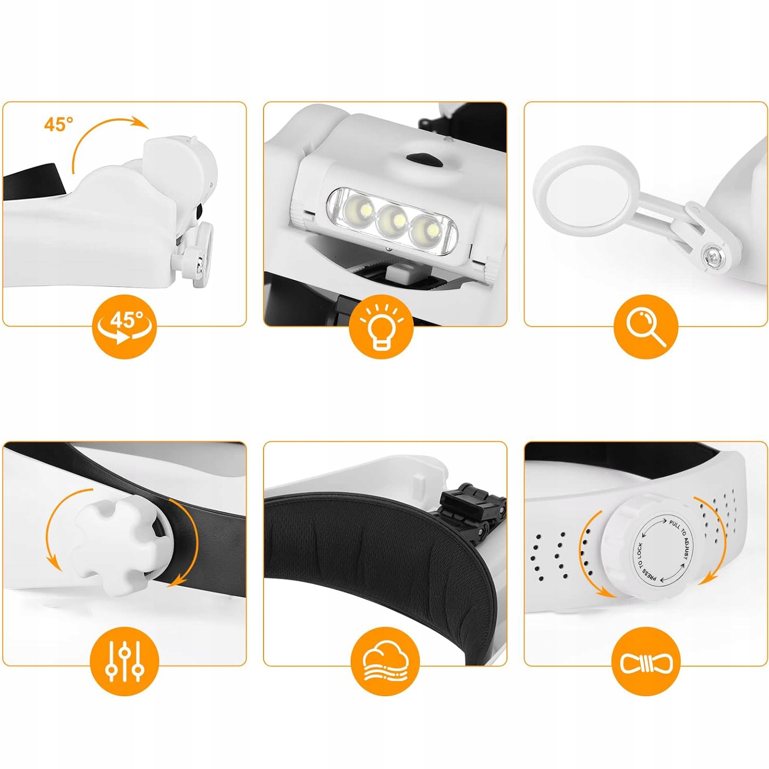 Главный ремешок с мягкой пеной, чтобы обеспечить максимальный комфорт, даже во время длительного износа. Освещенный луга имеет три ручки: две со стороны, чтобы отрегулировать высоту и угол объектива и одну сзади, чтобы соответствовать размеру головки. Компактная, круглая линза вращается при 360 °, и все линзы могут быть сложены или подняты, когда они не используются.