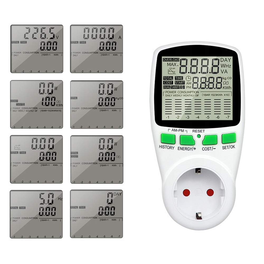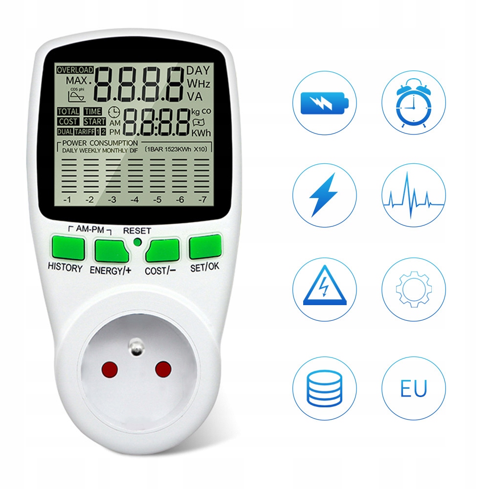 Счетчик позволит вам точно измерить потребление энергии в вашем доме. Благодаря ему вы легко сможете проверить, какие устройства потребляют больше всего энергии, что позволит исключить ненужных «пожирателей энергии». Снизив потребление энергии, вы уменьшите свои счета за электроэнергию. Цифровой счетчик позволяет реалистично рассчитать стоимость потребляемой энергии, если установить цену за 1 кВтч, то продукт будет рассчитывать стоимость потребленной энергии на постоянной основе.
