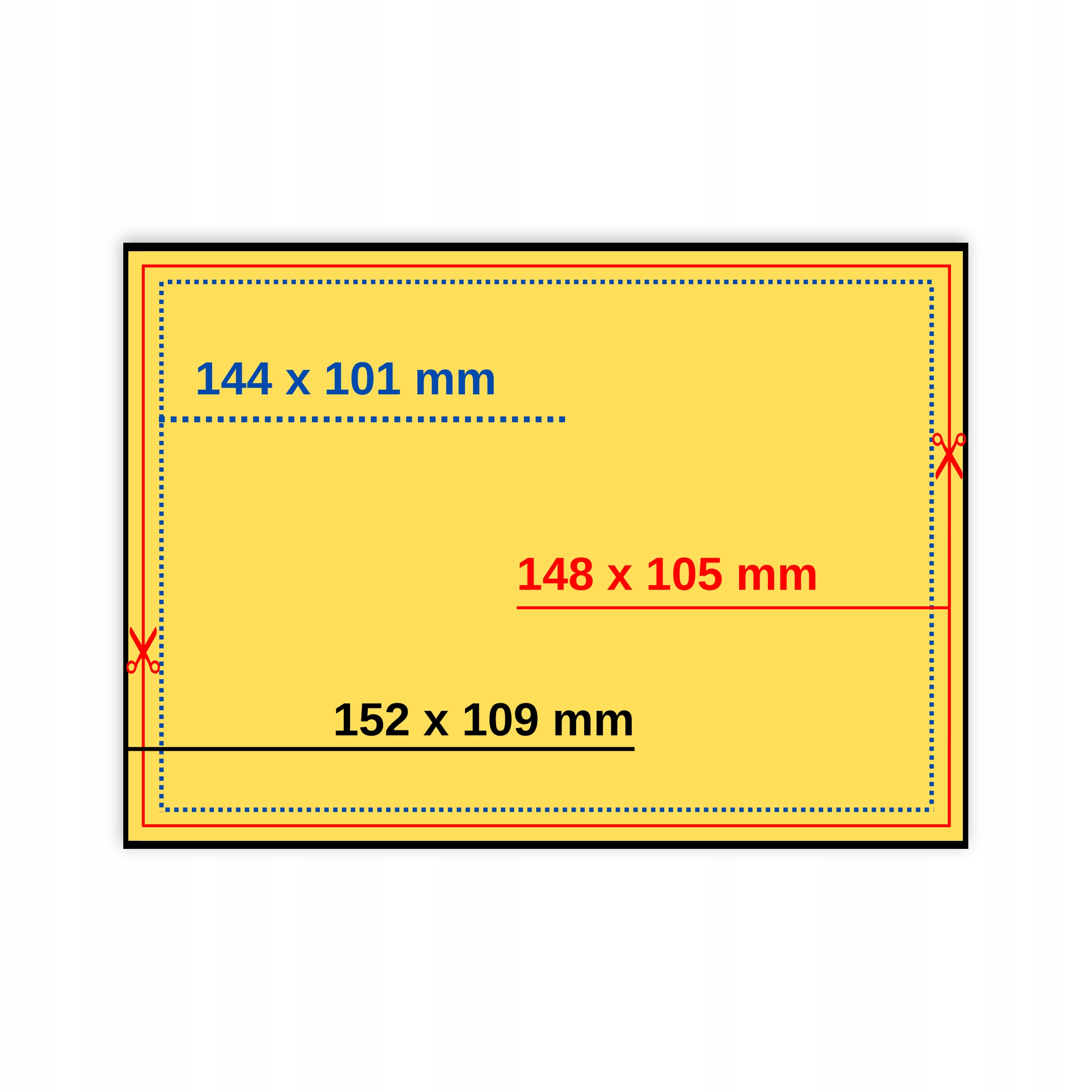 1. Формат до обрезки (вылет за обрез, отмечен черной рамкой): 152x109 мм, вылет по 2 мм с каждой стороны