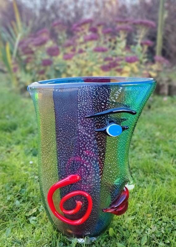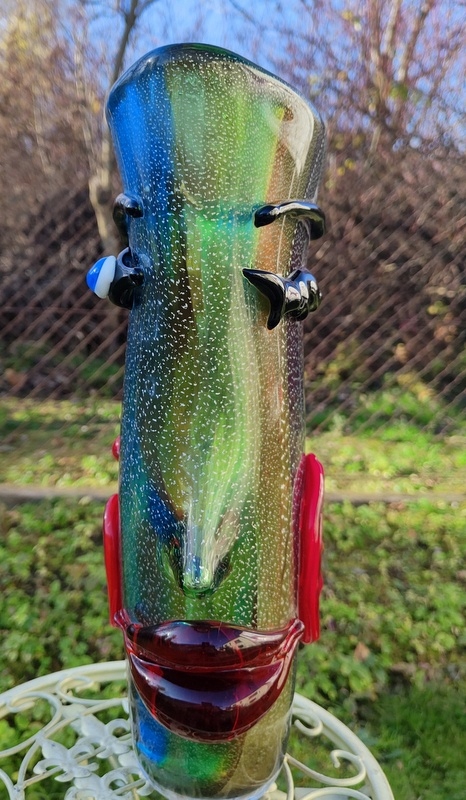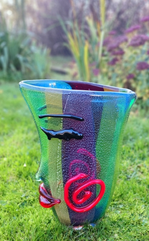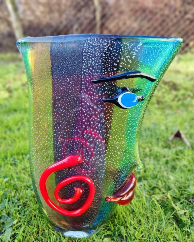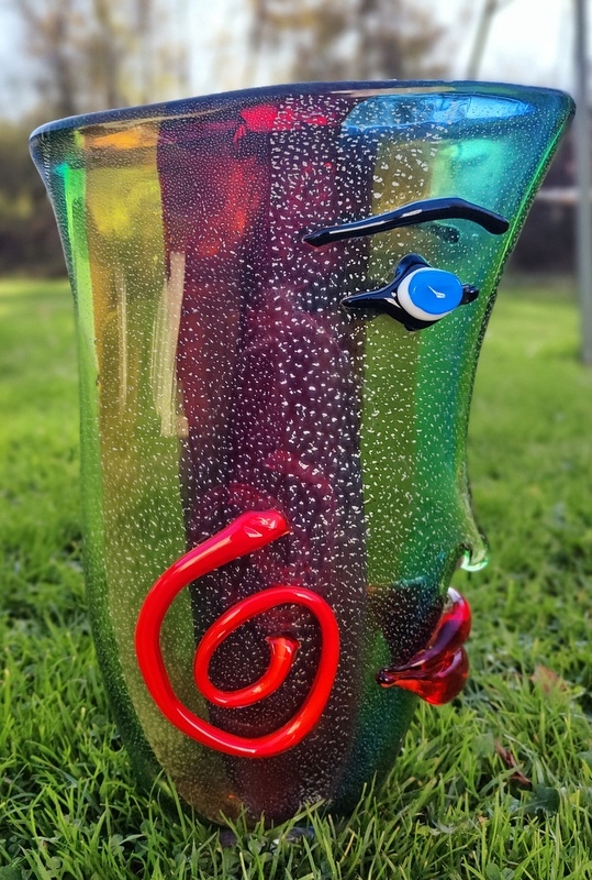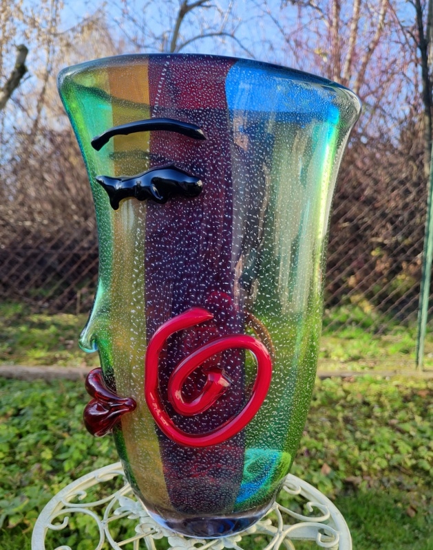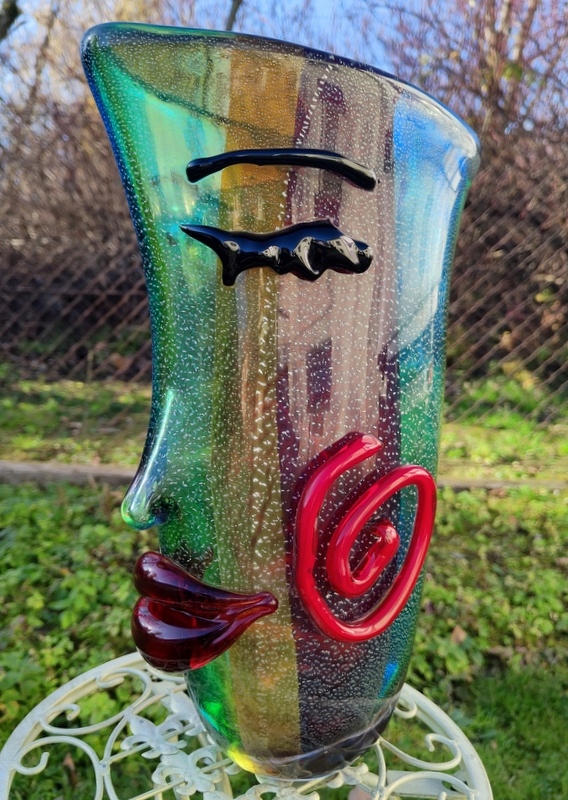 На аукционе представлена красота чудесной вазы в форме лица. Пожалуйста, обратите особое внимание на точность его изготовления (выполнено в стиле итальянского Мурано) и уникальные цвета.