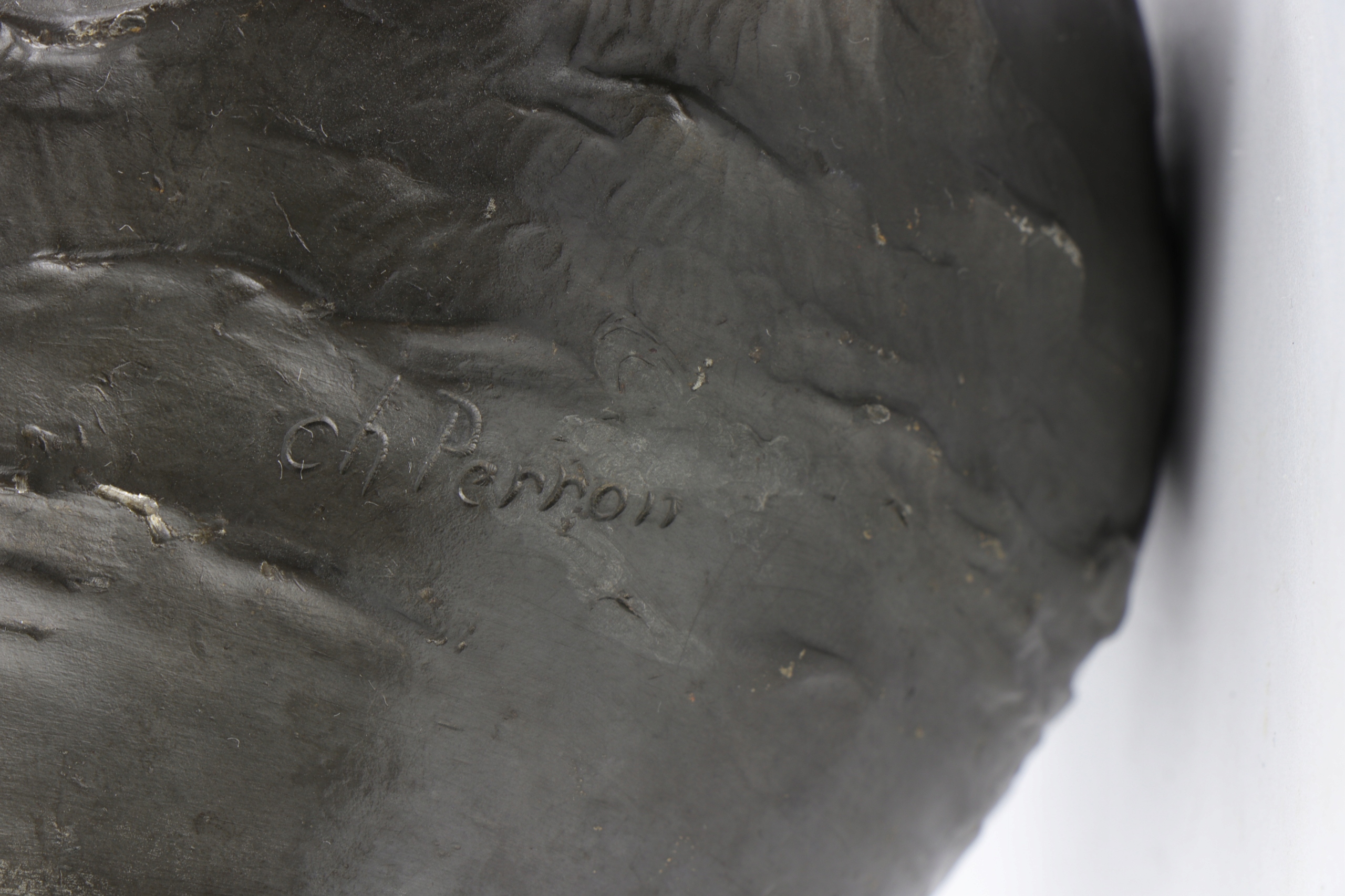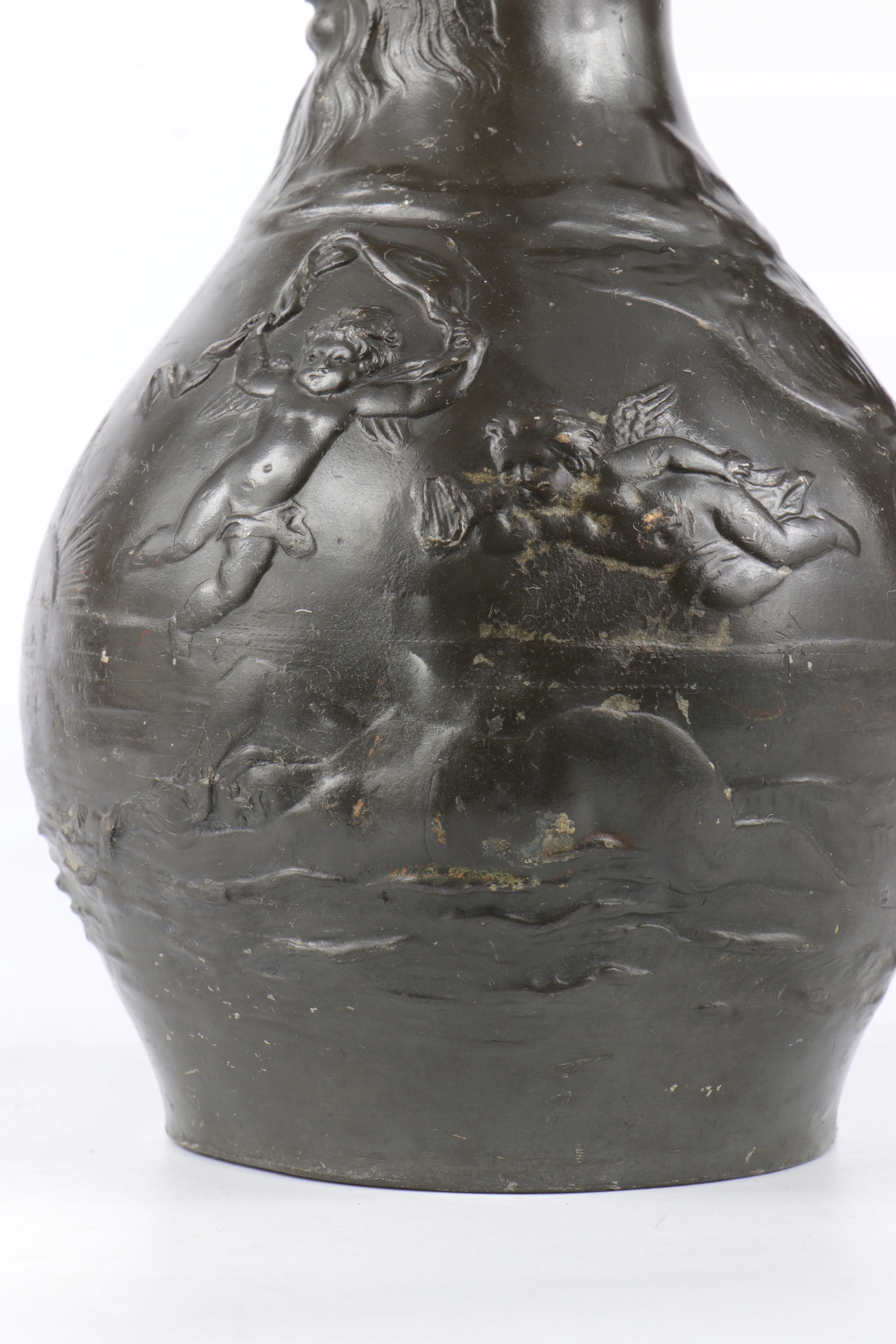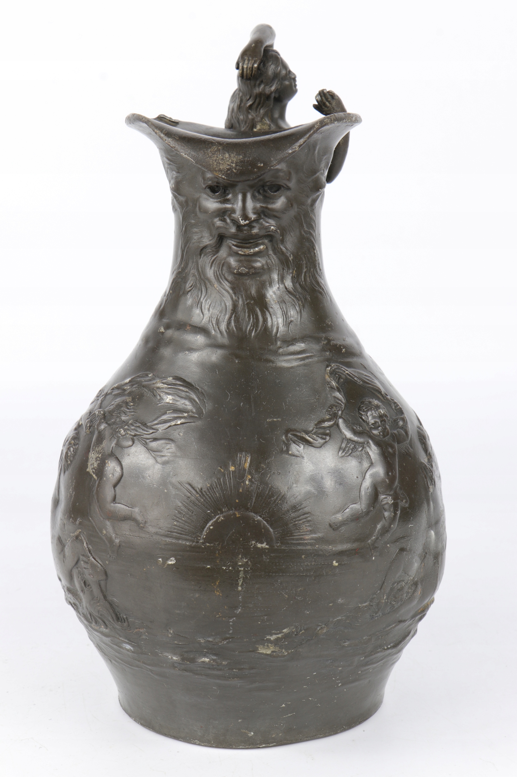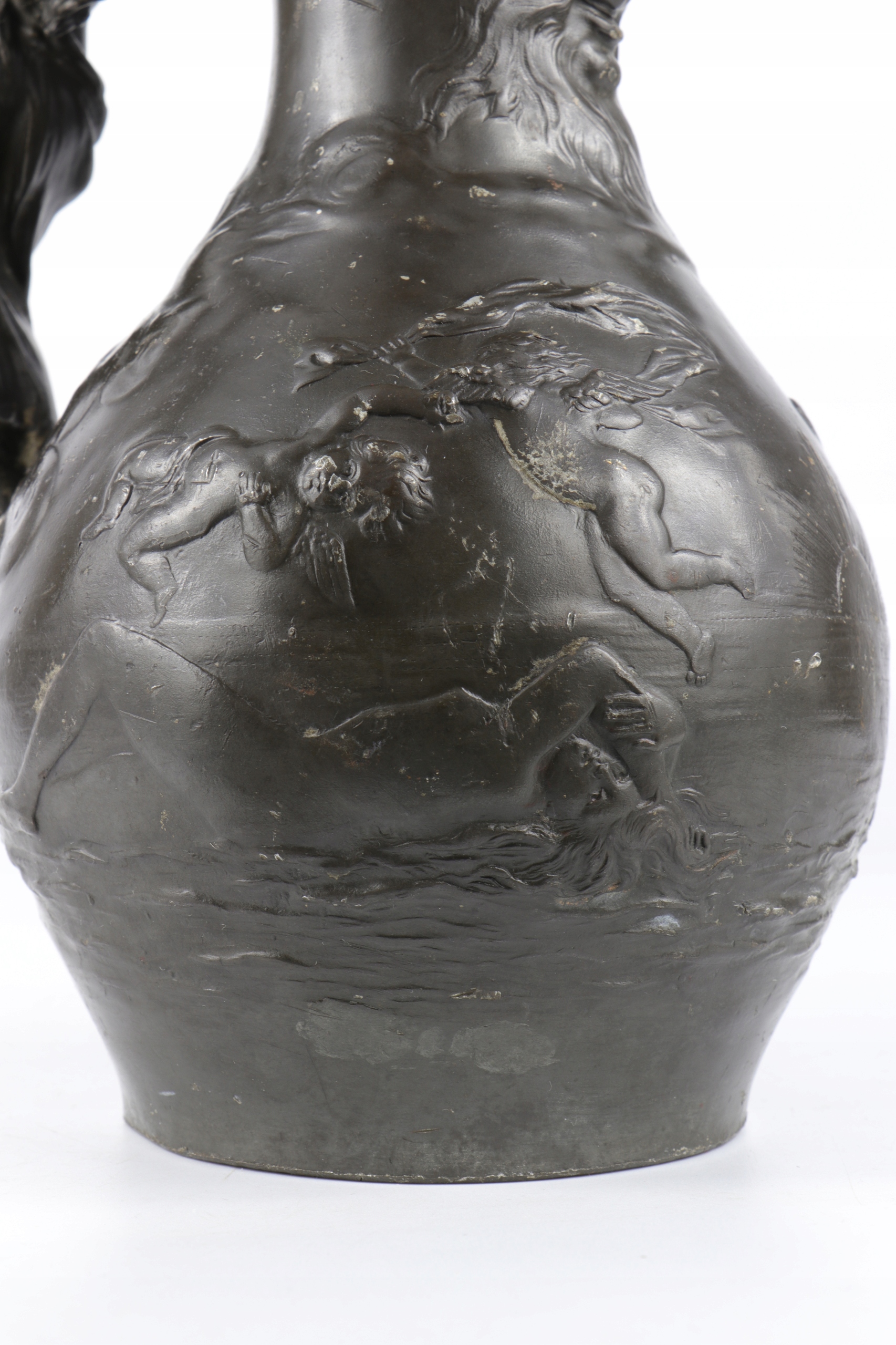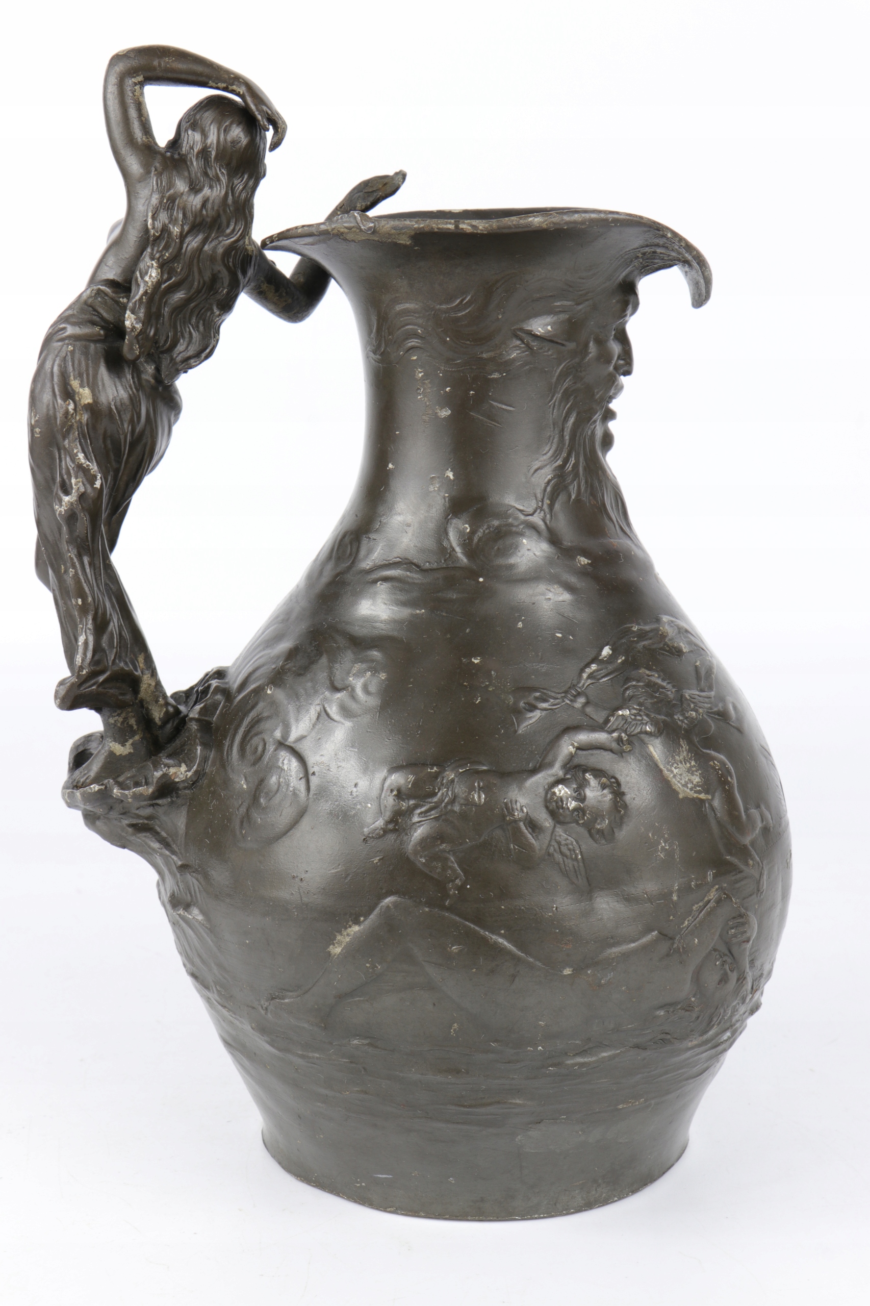 Tin Buruged подписал Ch. Перрон, Чарльз Теодор Перрон (1862-1934). Сина очень интересная ручка стилизована в форме женщины. На животе кувшина, рельефные фигуры маленьких херувимов и двух Венера лежали среди волн. Толстая массивная олова.