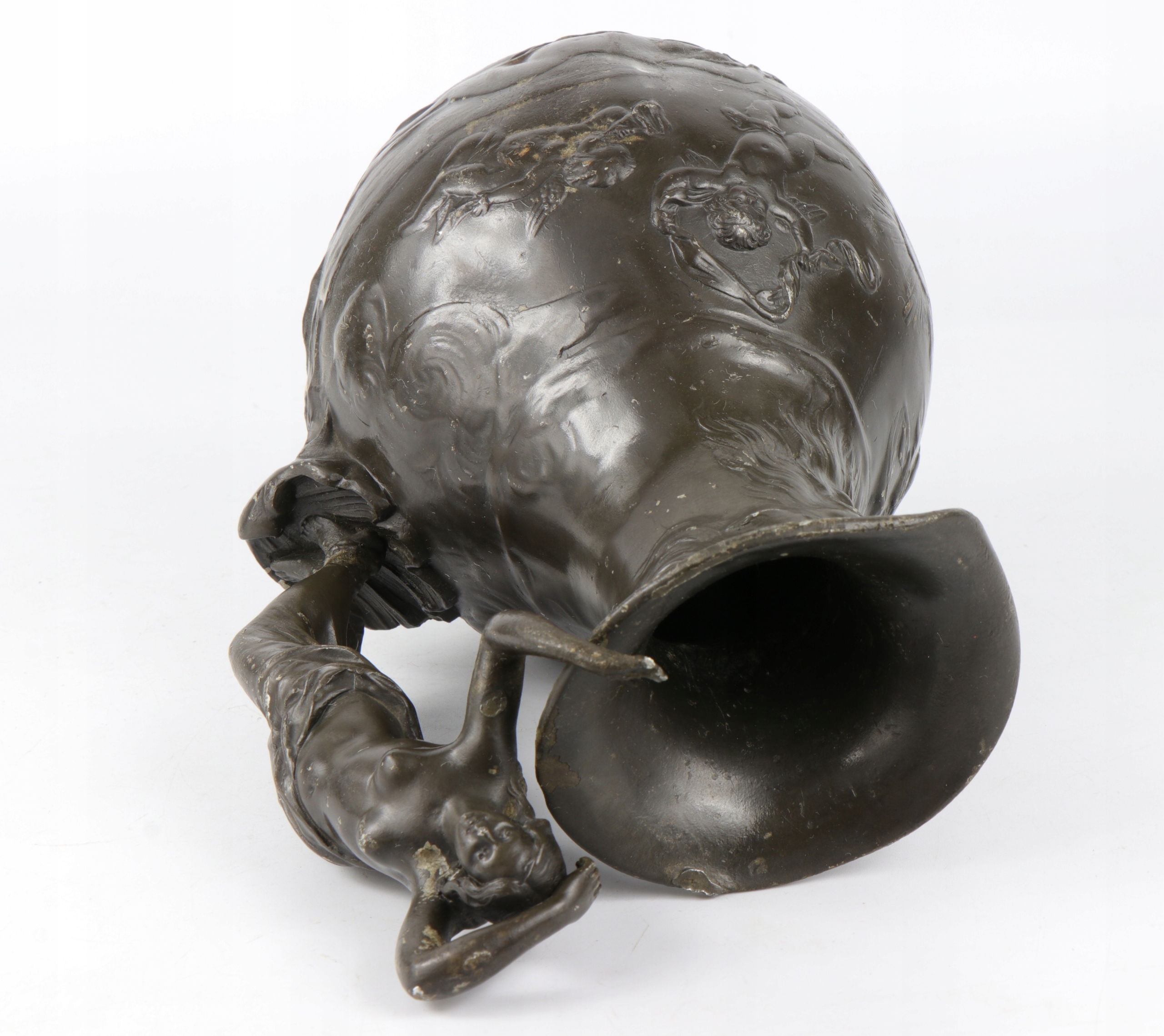 Как можно увидеть на картинках. Поврежденный кувшин, отсутствие в верхней части на звании кувшина маленького херубнера, удерживаемого фигурой женщины, и соединяющего ручку с помощью удара. Несмотря на это, форма женщины в форме захвата очень крепко прикреплена. Минимальные вмятины и дефекты патины с поверхности кувшина. Несмотря на дефекты, кувшин очень декоративный и декоративный.