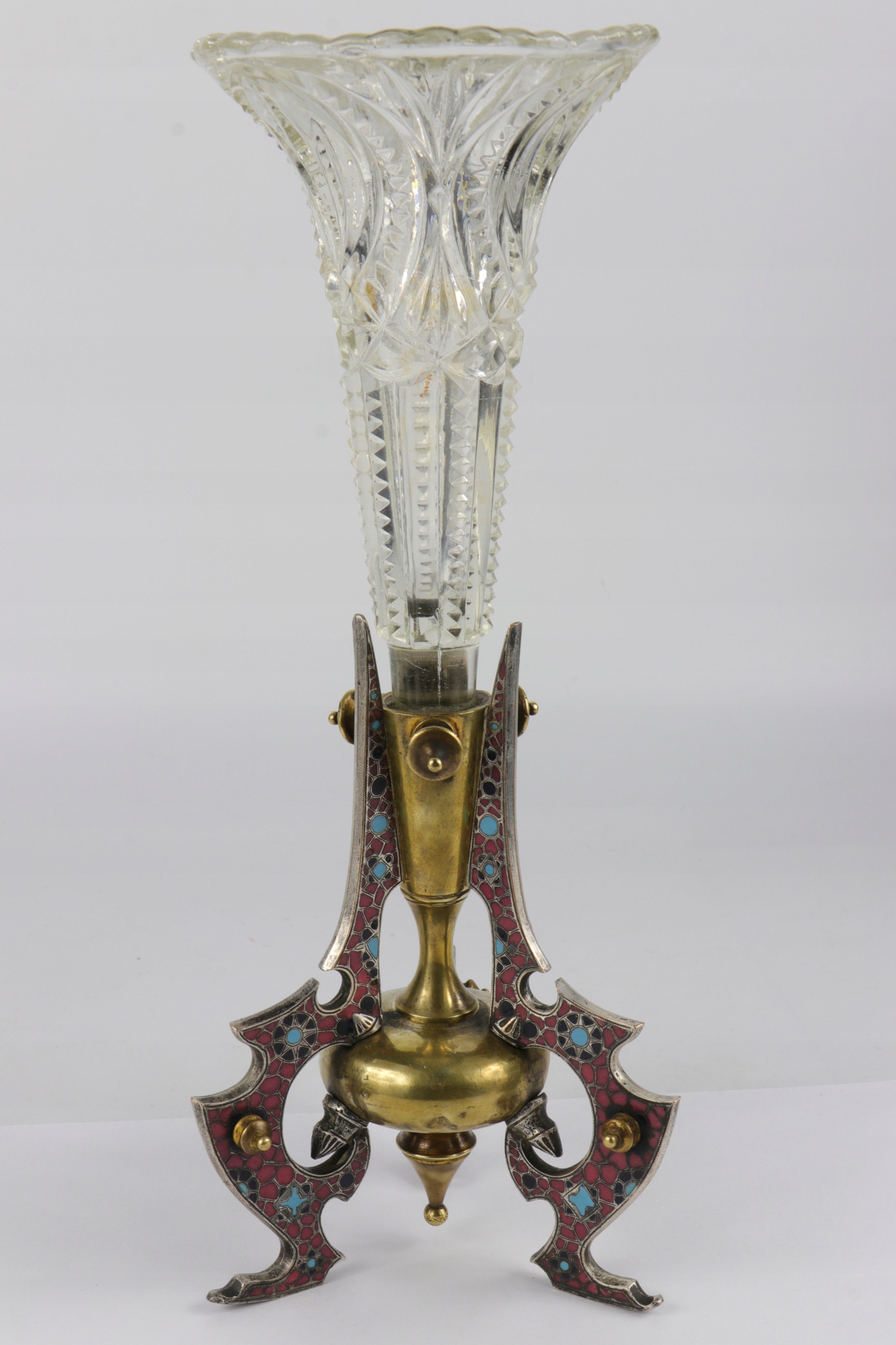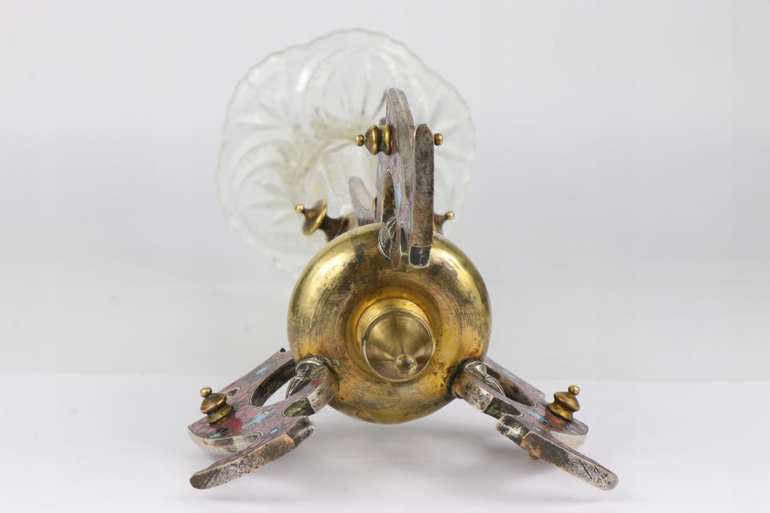 Ваза со стеклянной флейтой вазой, украшенная французской питомной эмалью под названием ChampleVe. Эмаль уложена на коричневый серебро. Массивное глазированное стекло. Красивая очень оригинальная форма вазы. Картинки хорошее состояние, видимые минимальные признаки использования. Одна из ног слегка движется