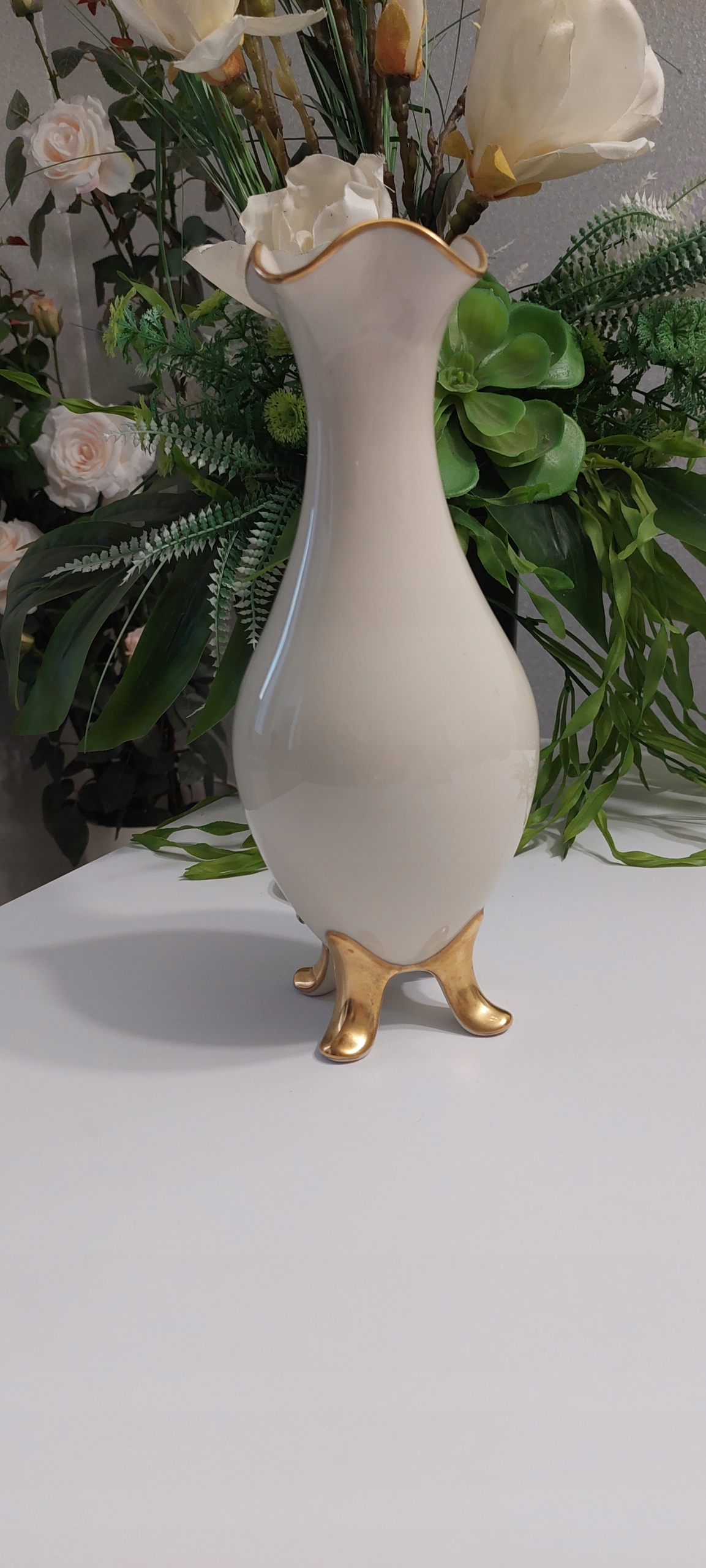 Ваза цвета экрю, размеры: высота 26 см, диаметр бортика: 8 см.